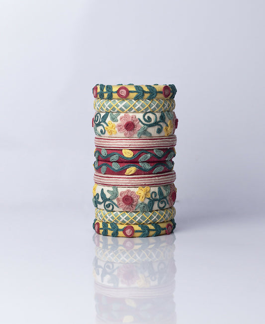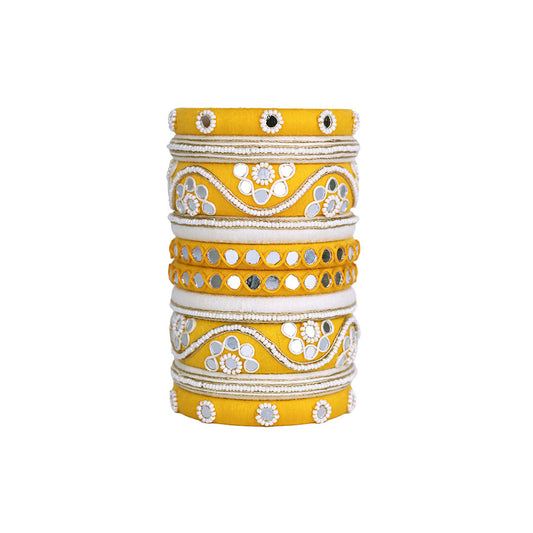 Peethi Yellow Beaded Mirror Work Bangle Set