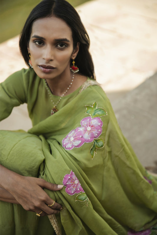 Leela Olive Green Organza Handpainted Saree
