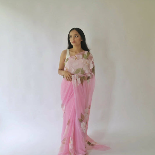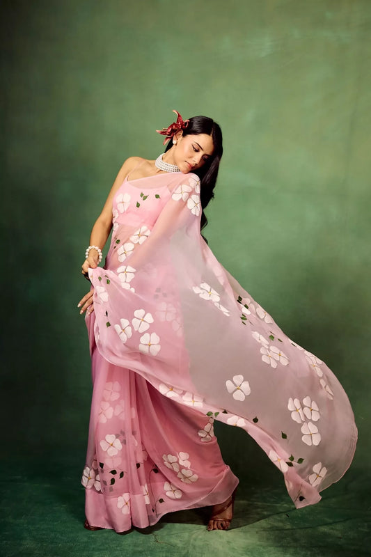 Hibiscus Chiffon Saree In Pink Base