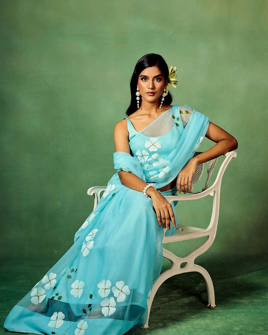 Ash Blue Half-Daisies Chiffon Saree