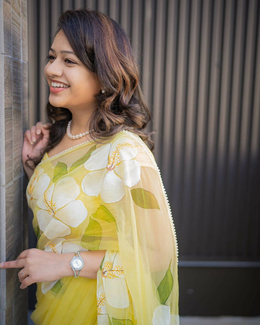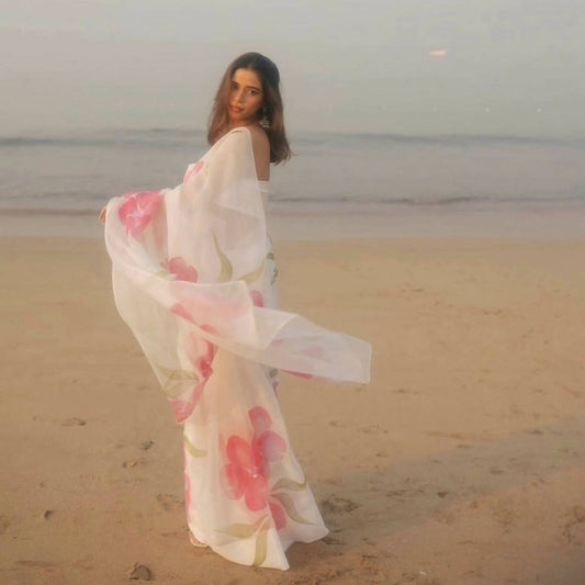 Hibiscus Chiffon Saree With Pearl Border