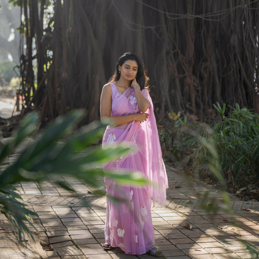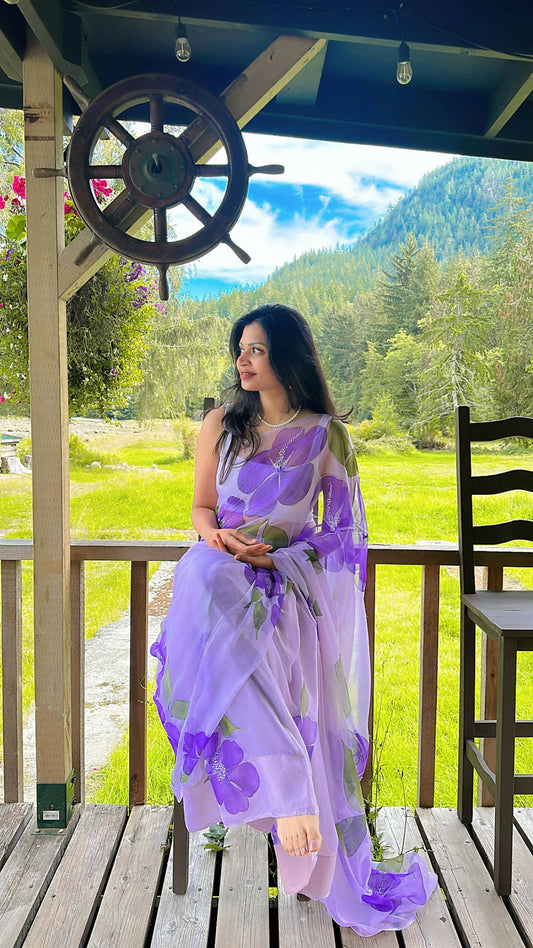 Lavender Hibiscus Chiffon Saree