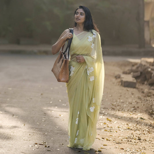 Half-Daisies Olive Green Chiffon Saree