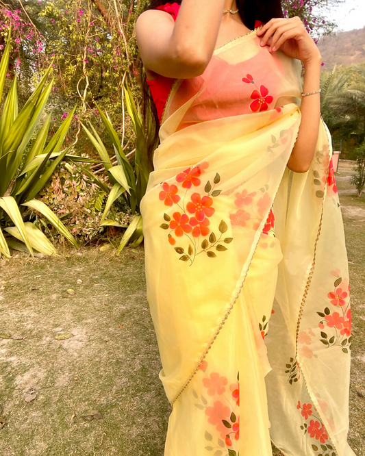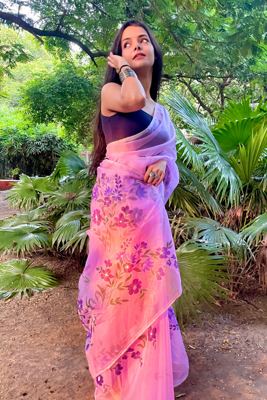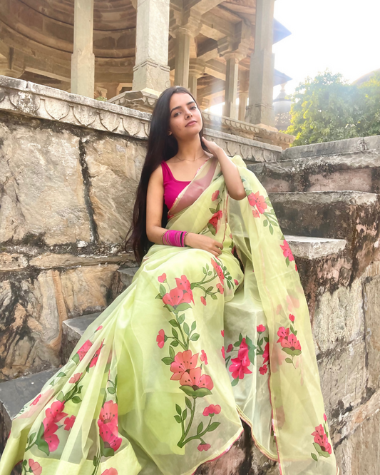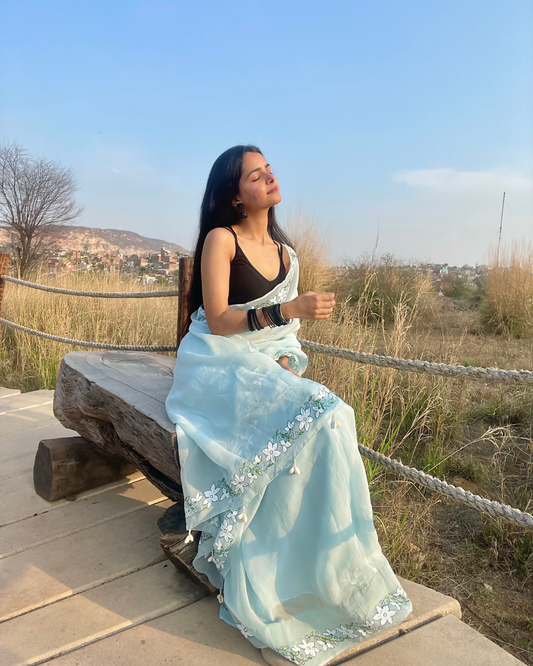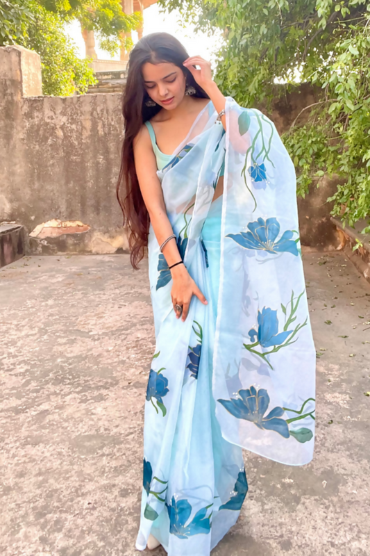 Topaz Teal Aarzoo Handpainted Organza Saree