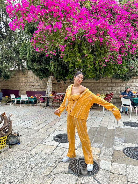 Yellow Embroidered Shirt with Red Lehariya Bralette Combo