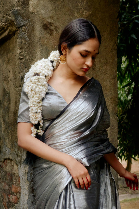Ardhachandra Solid Silver Handloom Tissue SareeVendor:Huts and LoomsSale price From ₹3,28510% OFFRegular priceUnit price per₹3,650Sale