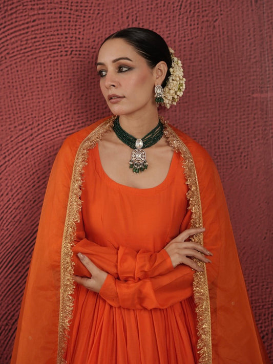 Chaand Orange Chanderi Aariwork Anarkali Suit Set