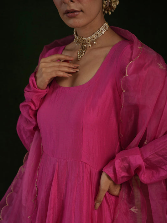 Chaand Fuchsia Pink Chanderi Anarkali Set with Aari Work Bottom