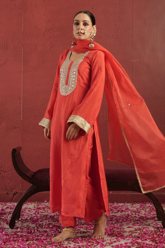 Chaand Hand-dyed Red Silk Zariwork Suit Set