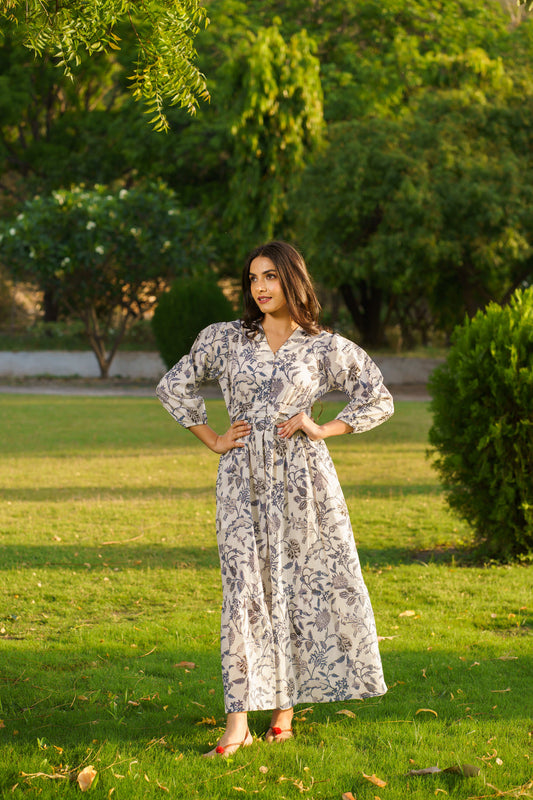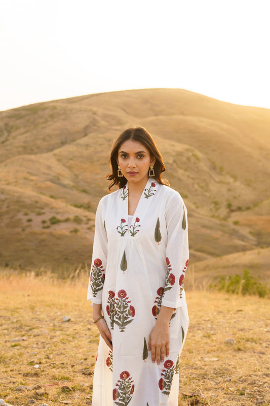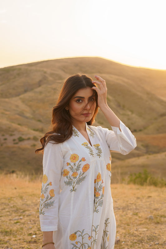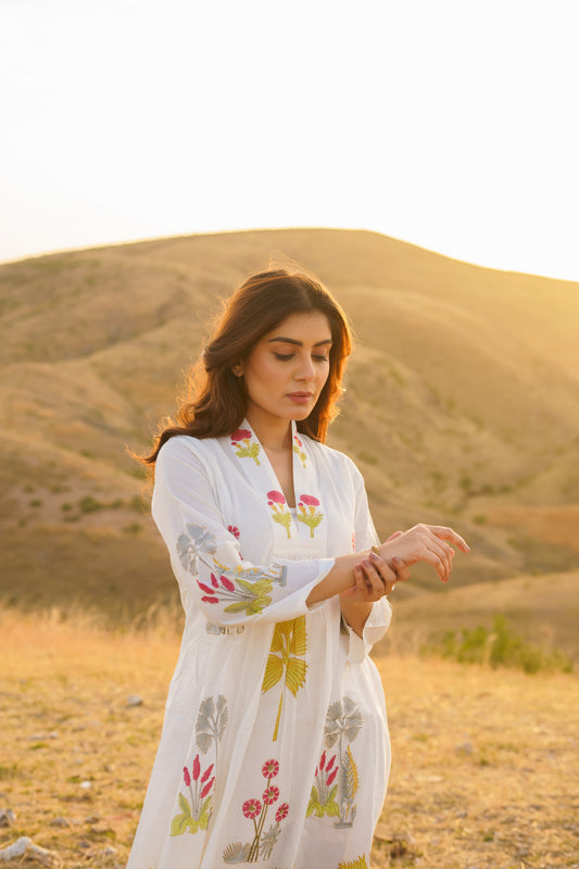 Gulbahar White Cotton Hand Block Print Maxi Dress