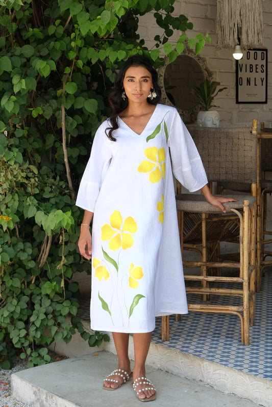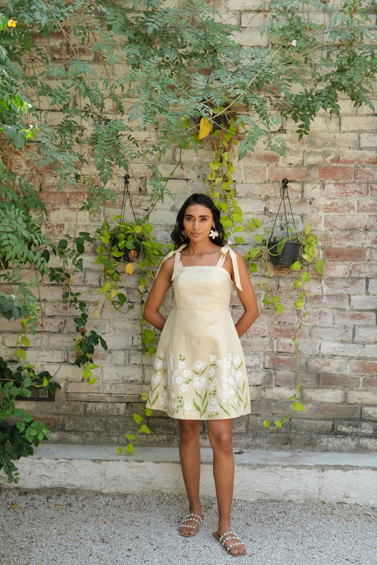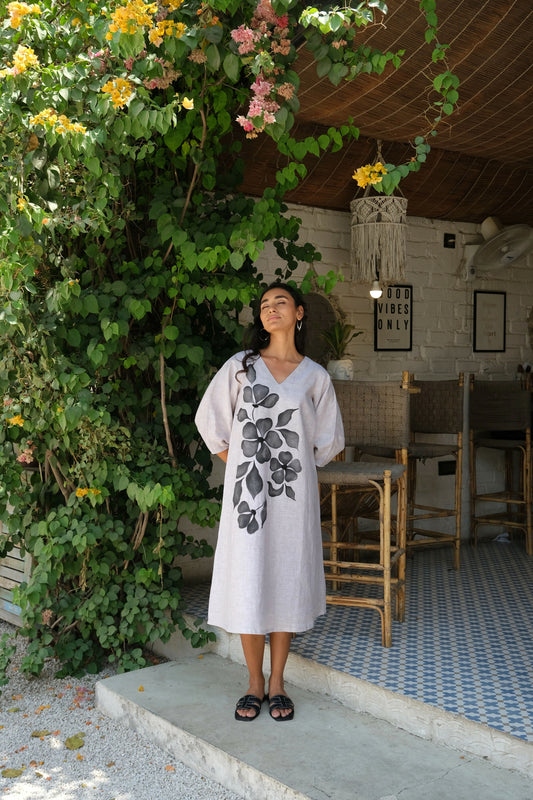 Gardenia Hand-painted Linen A-line Dress in Beige
