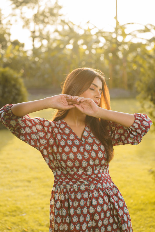 Gulbahar Maroon Cotton Hand Block Print Maxi Dress