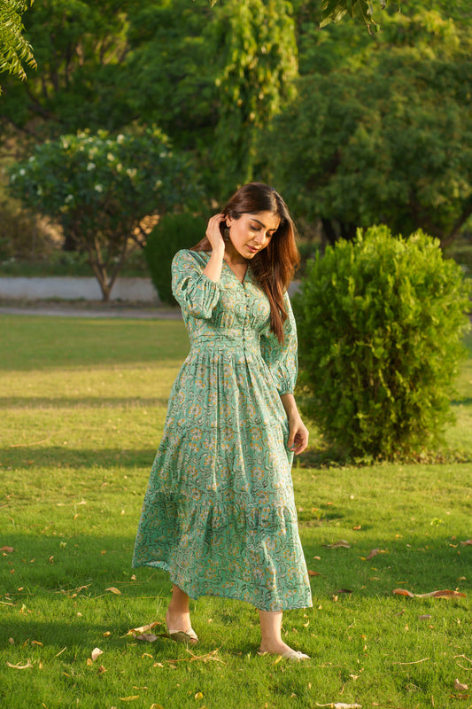 Gulbahar Mint Green Cotton Block Print Maxi Dress