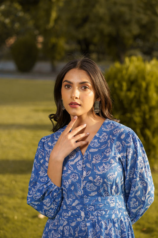 Gulbahar Blue Cotton Hand Block Print Maxi Dress