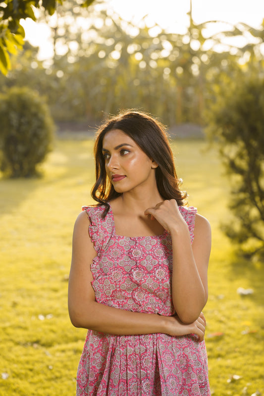 Elsa Pink Cotton Block Print Ruffled Co-ord Set
