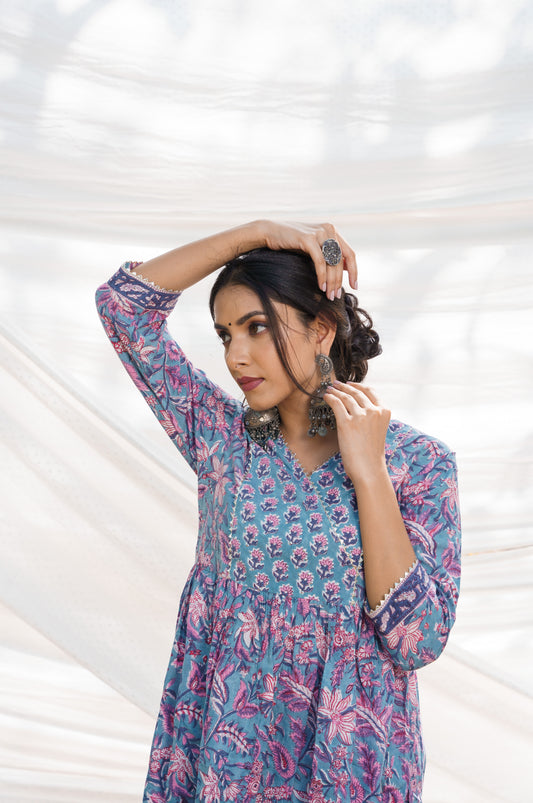 Nazakat Blue Cotton Block Print Kurta Set