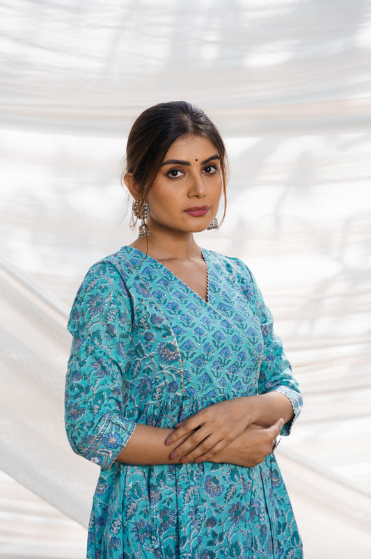 Nazakat Turquoise Cotton Block Print Kurta Set