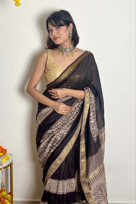 Be My Mystry Mulmul Cotton Block Printed Black Saree