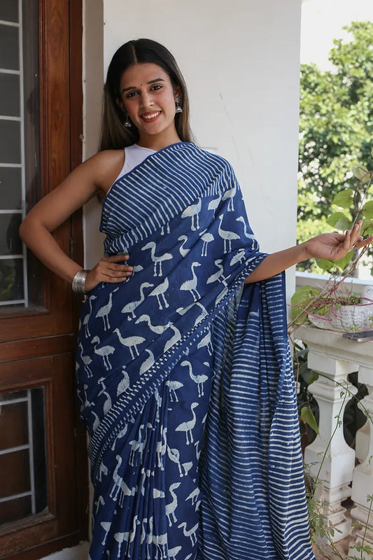 Indigo Flamingoes - Dabu Hand Block Print Mulmul Cotton Bagru Saree