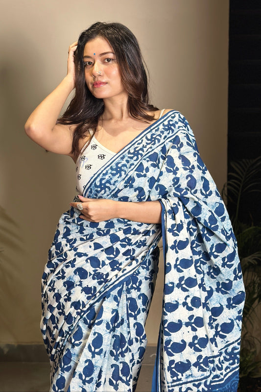Inspired by Clouds Indigo Cotton Mulmul Dabu Saree