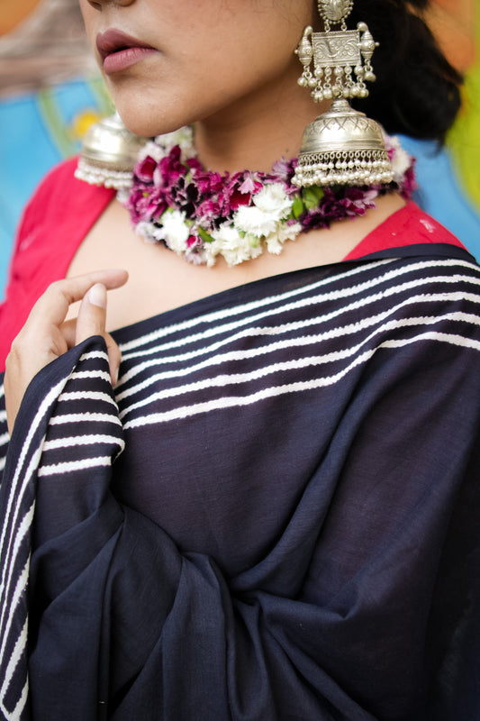 Coal Black Handblock Print Natural Dyed Mulmul Cotton Saree