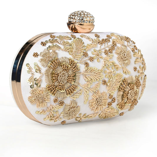Dazzling White Dabka Oval Clutch: Classic Elegance