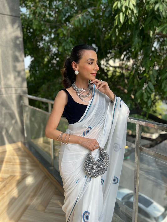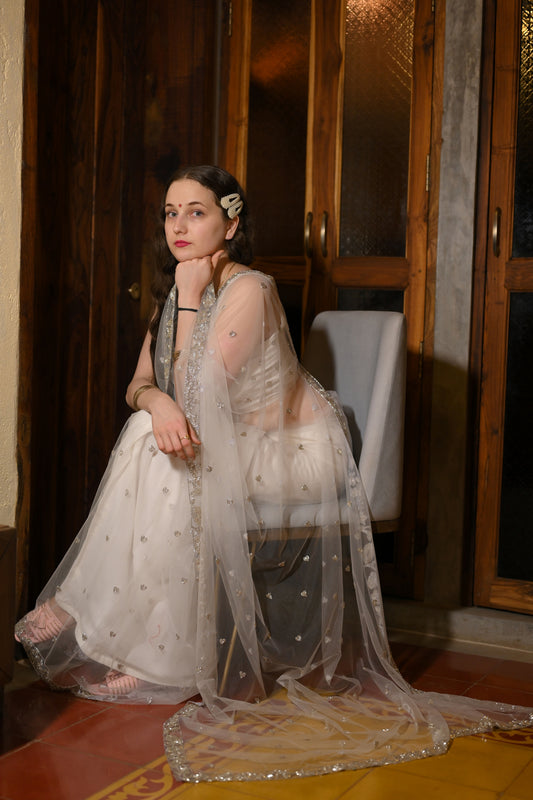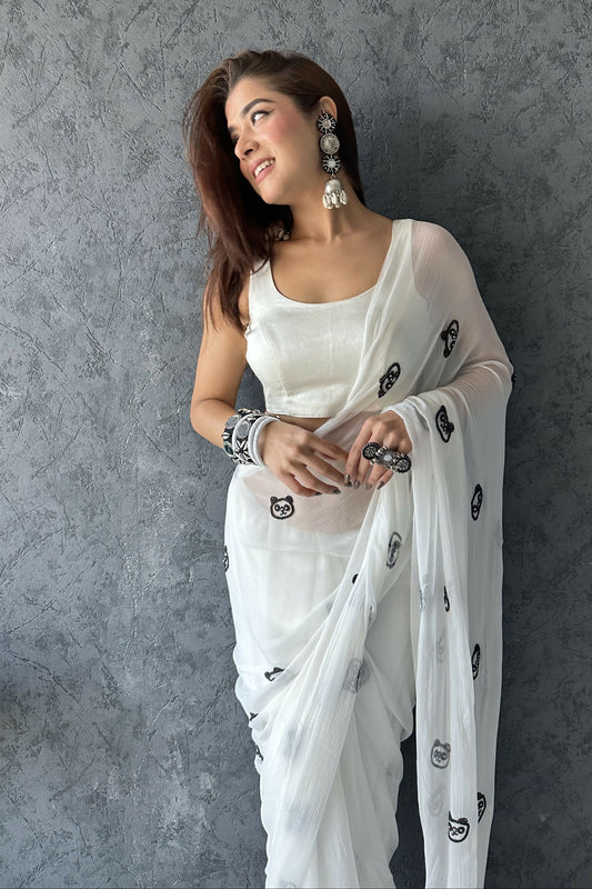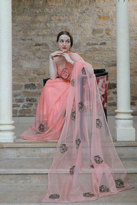 Roar Tiger Hand-embroidered Ivory Pure Silk Organza Saree