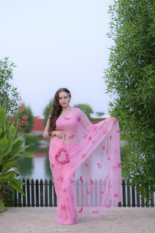 Pink on Pink Heart Hand-embroidered Georgette Saree