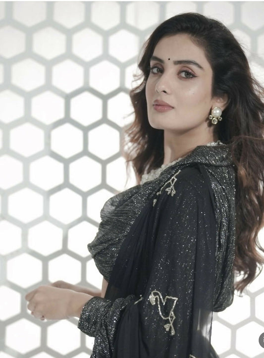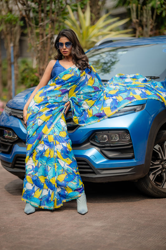 Hand-embroidered Unicorn Dark Turquoise Pure Georgette Saree