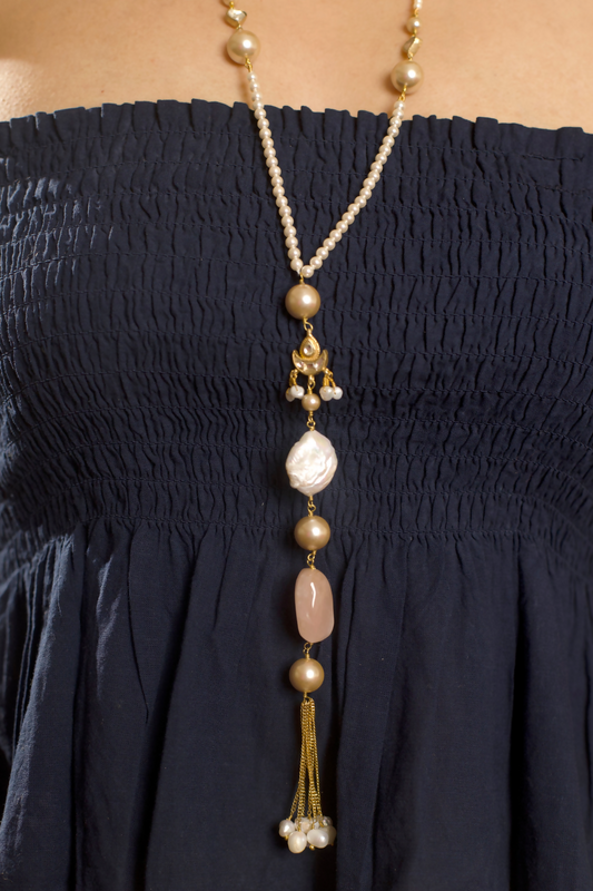 Rose Quartz & White Baroque Long Tassel Pearl Necklace