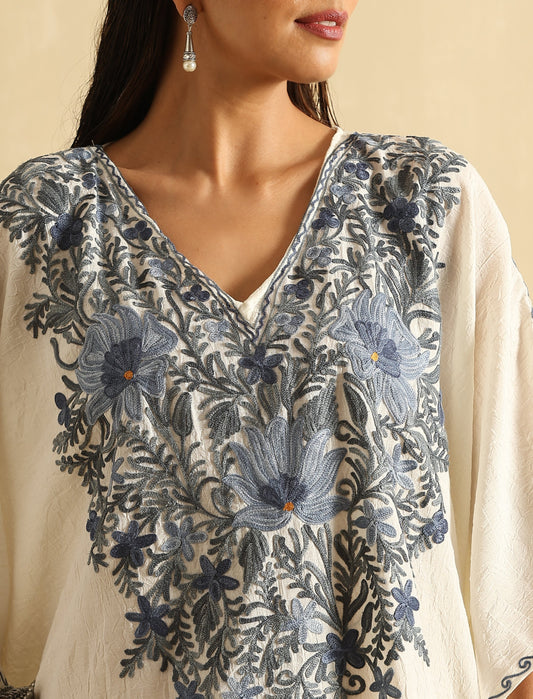Pearl White Aari Embroidered Kashmiri Kaftan- Short