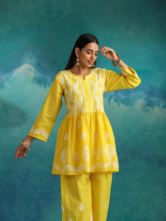 Sara Yellow Short Chikankari Anarkali Kurta Set