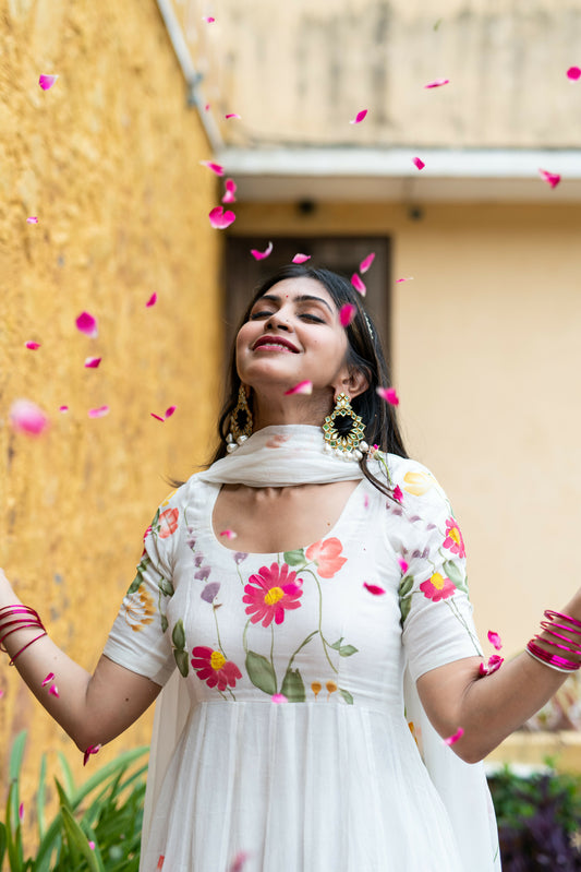 White Chiffon Handpainted Anarkali Suit Set