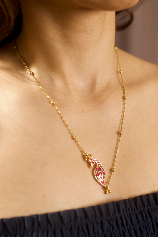 Pink Peacock & Golden Bells Chain Necklace