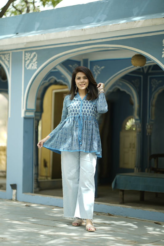 Indigo Printed Long Sleeves Peplum Top
