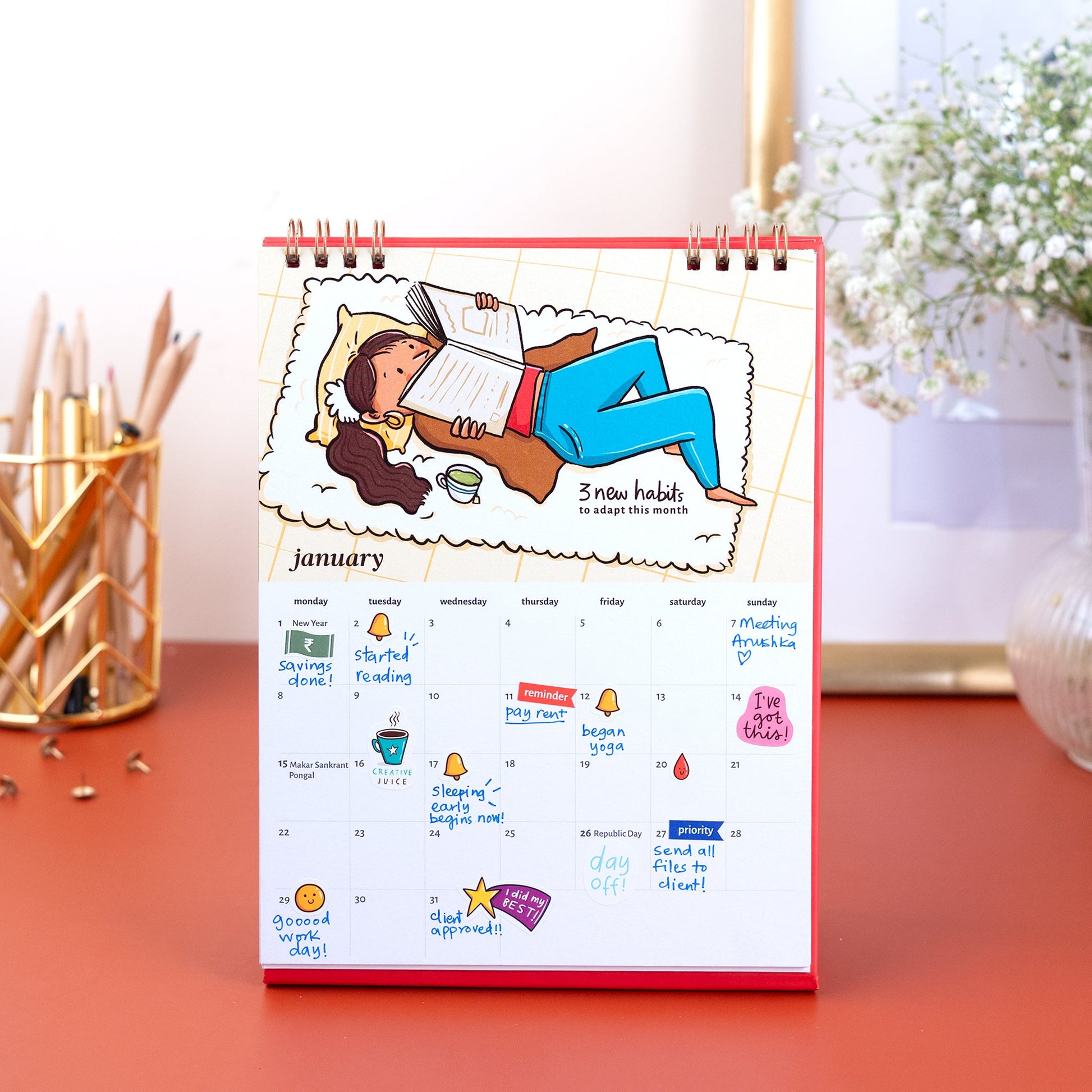 This calendar has monthly prompts that will nudge you to do atleast 3 good things for yourself. Paste the bell stickers on the days you did something nice for yourself! Come back at the end of the year and reflect on these sweet little moments you gathered - a good year indeed :) 2 sticker sheets /over 140+ stickers for free!
