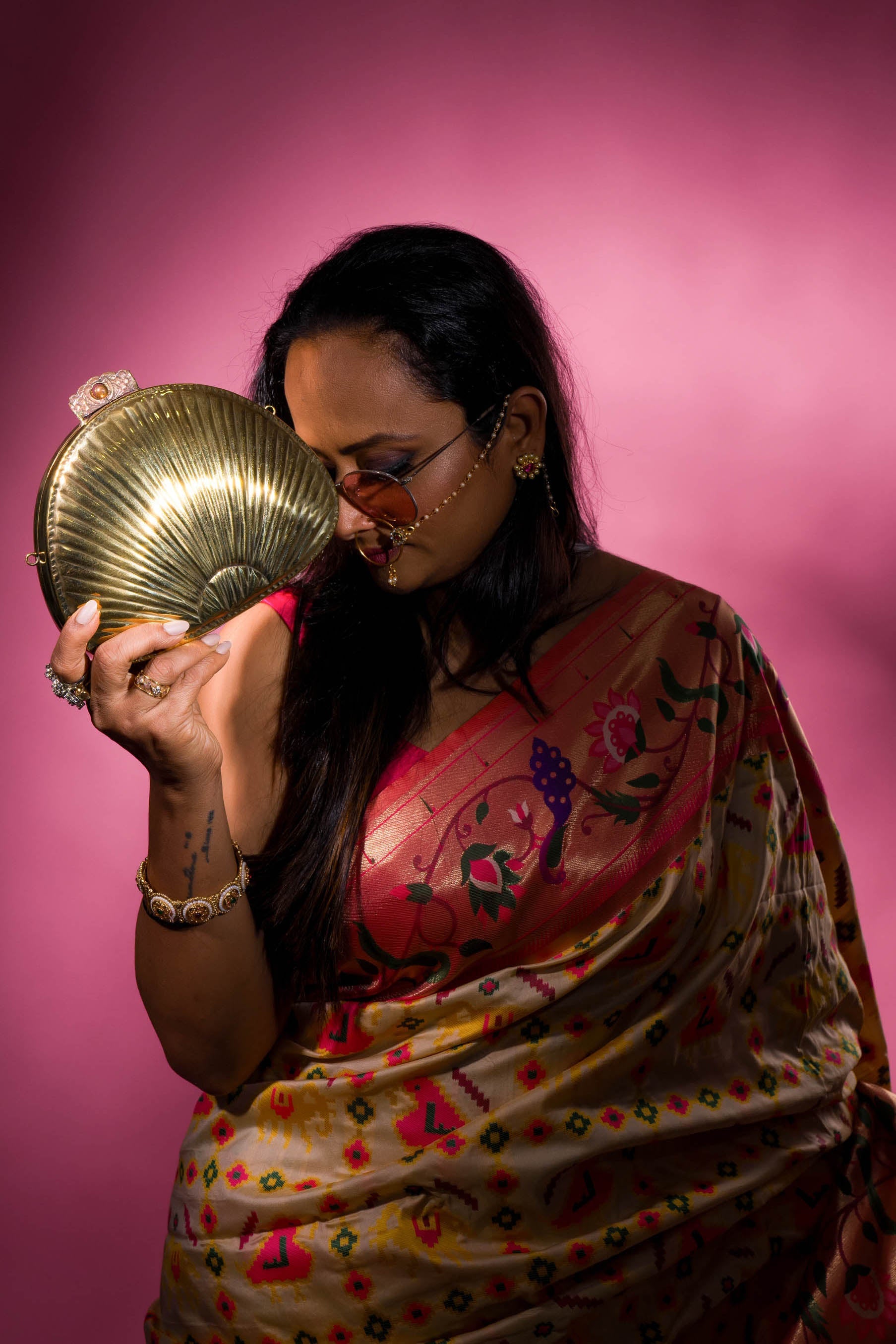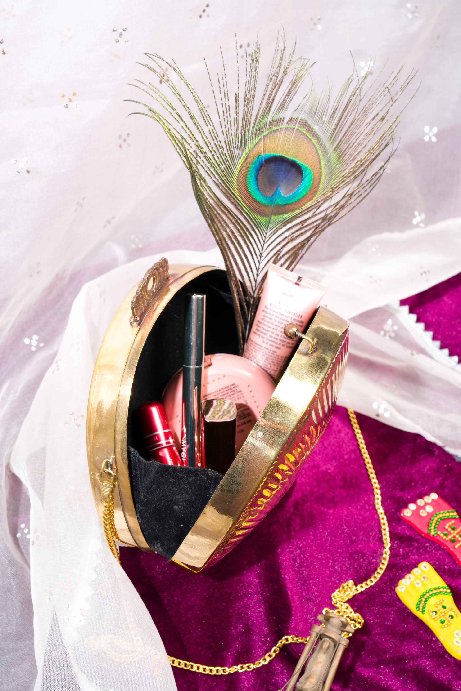 This vintage-inspired brass bag, crafted in a lustrous gold finish and shaped like a delicate shell, radiates timeless elegance. It features an ornate antique clip closure and a comfortable sling chain. The interior is lined with luxurious black velvet, adding a touch of sophistication to its classic design.