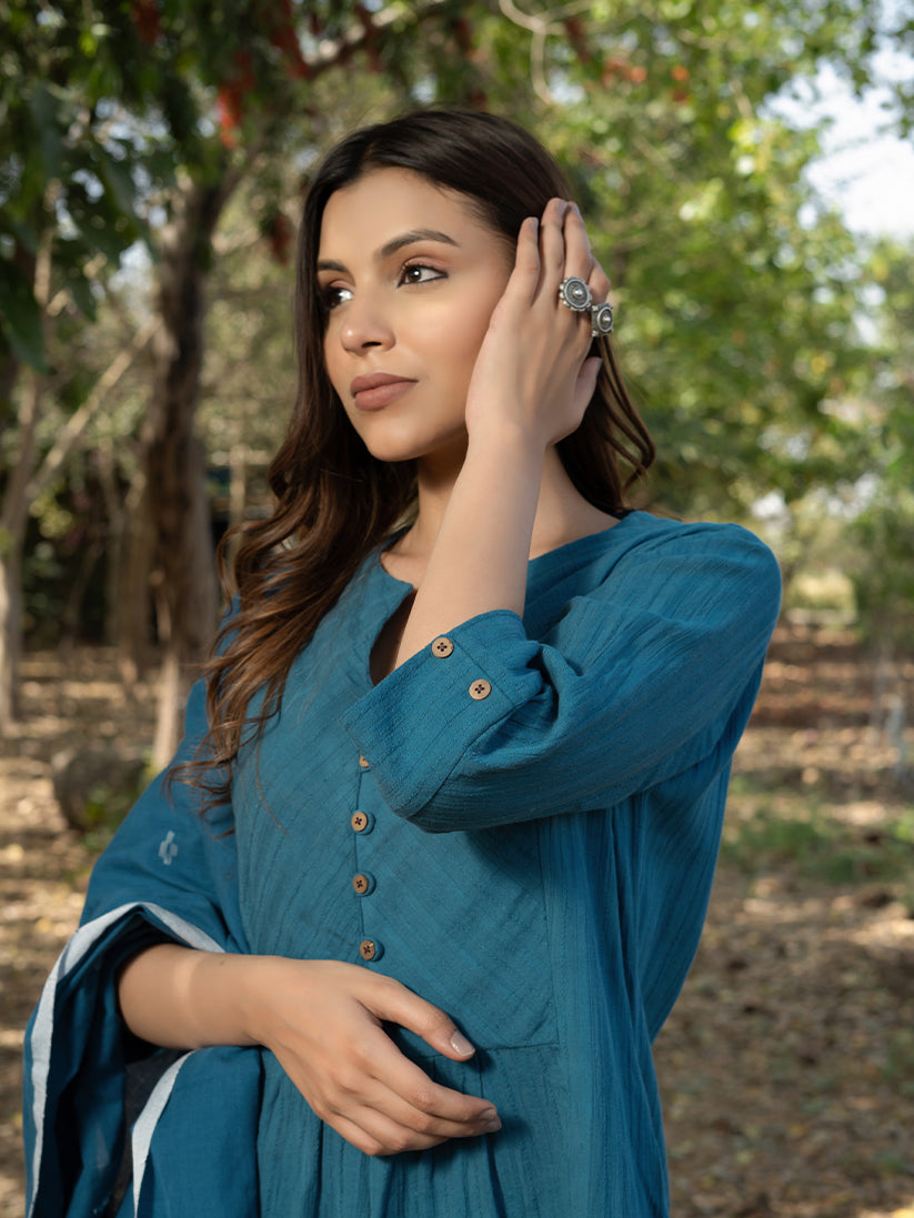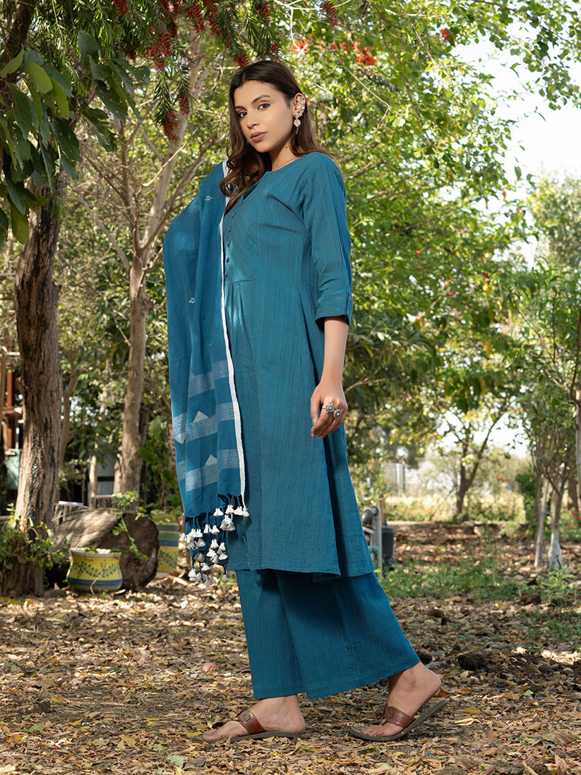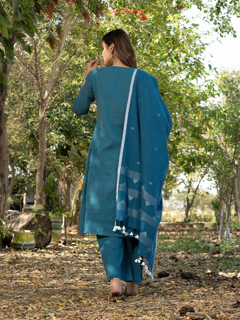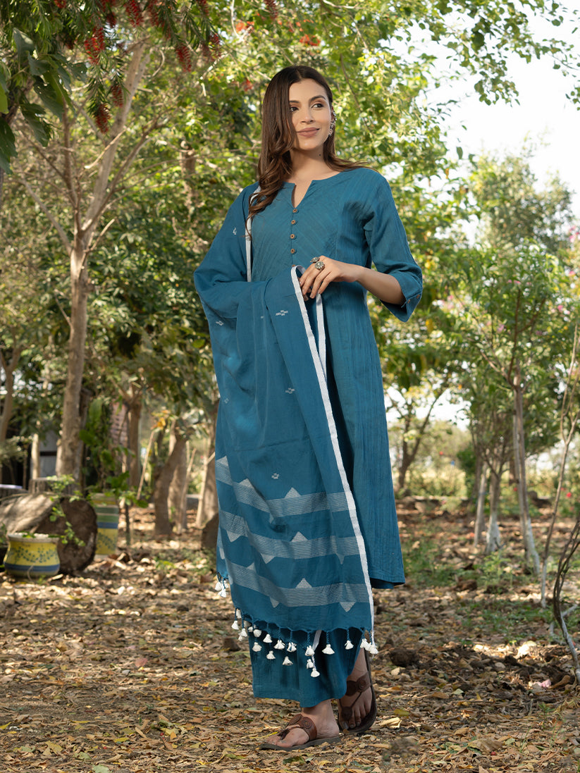 Blue colored kurta with mock placket on the front. Kurta has inseam pockets and is paired with coordinated palazzos. To complete the look, we have added handwoven pure Jamdani cotton dupatta with it.