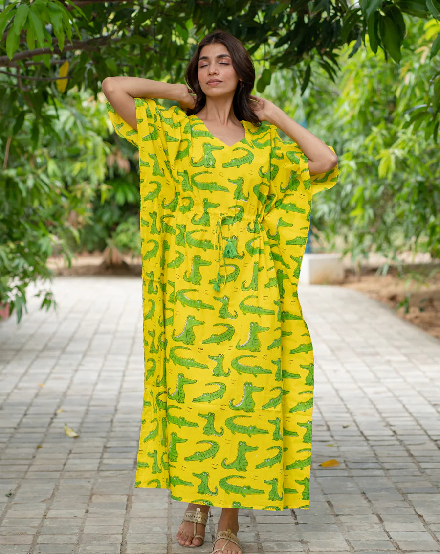Crafted with love and attention to detail, this handcrafted kaftan dress showcases stunning handblock printing, making it a one-of-a-kind addition to your wardrobe. Perfect for relaxing, lounging, or any occasion, it effortlessly complements your style mantra with its versatile, laid-back elegance.