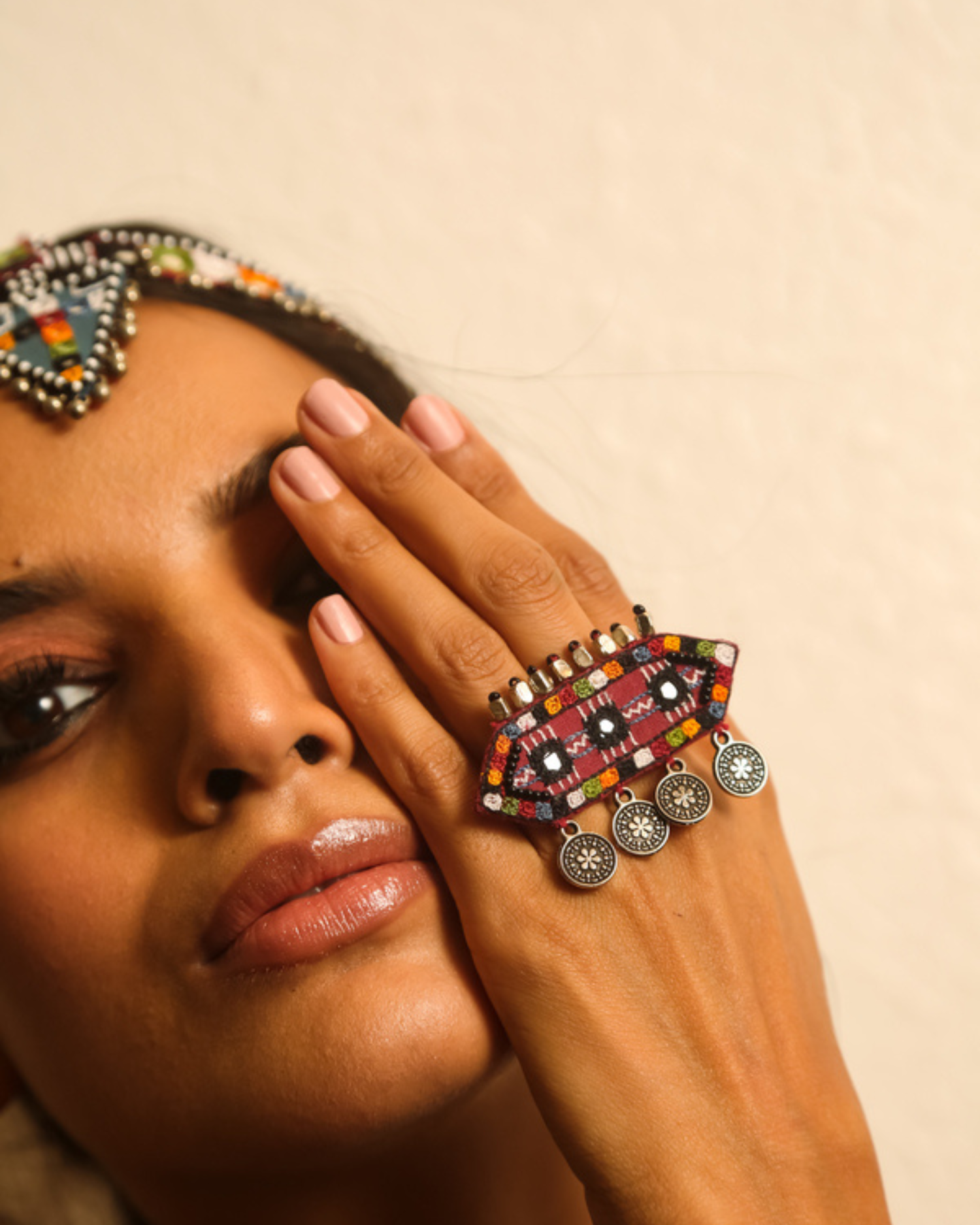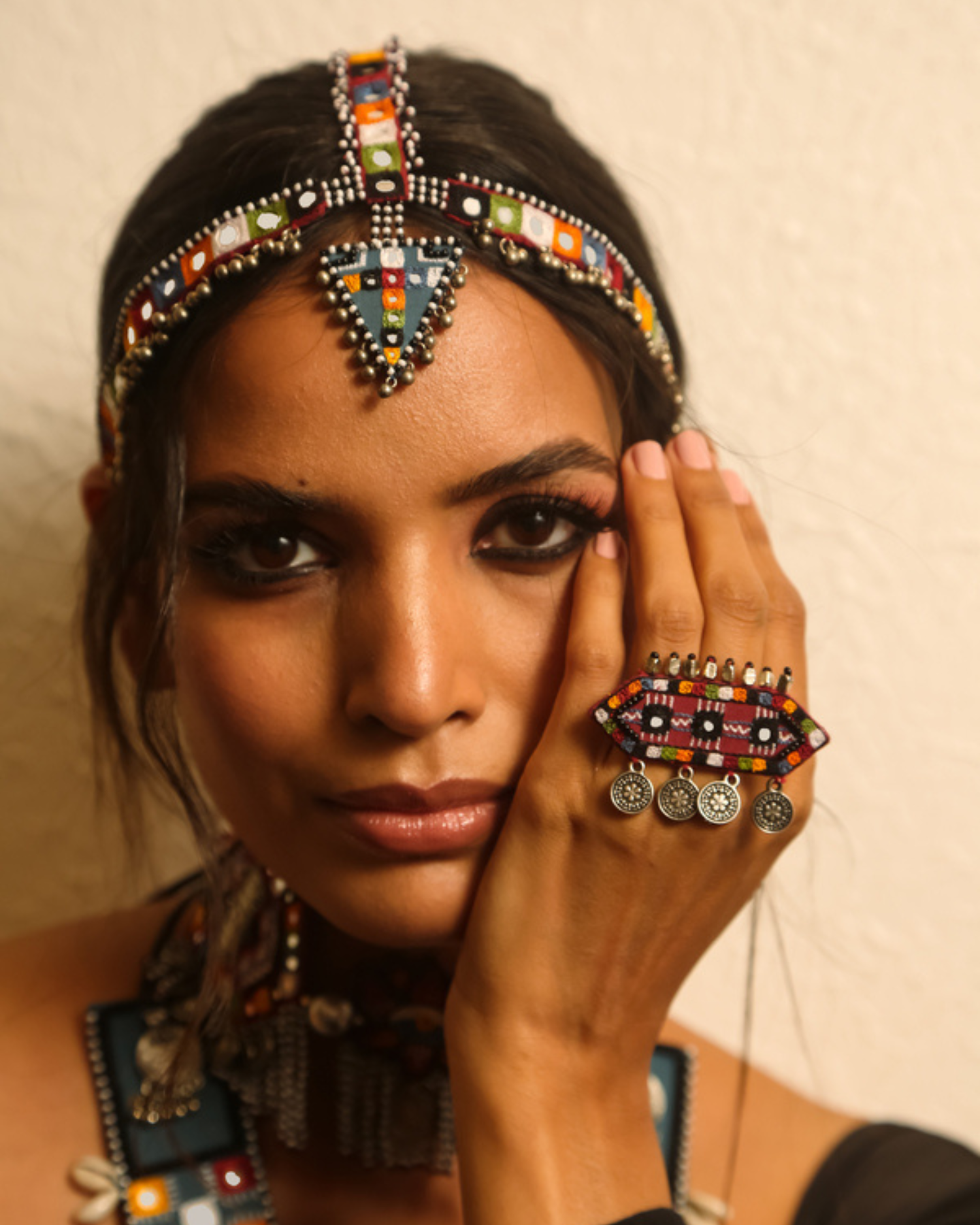 Materials: Organically dyed beads, Mirrors and Metal Elements, Anchor and Resham Threads on Fabric