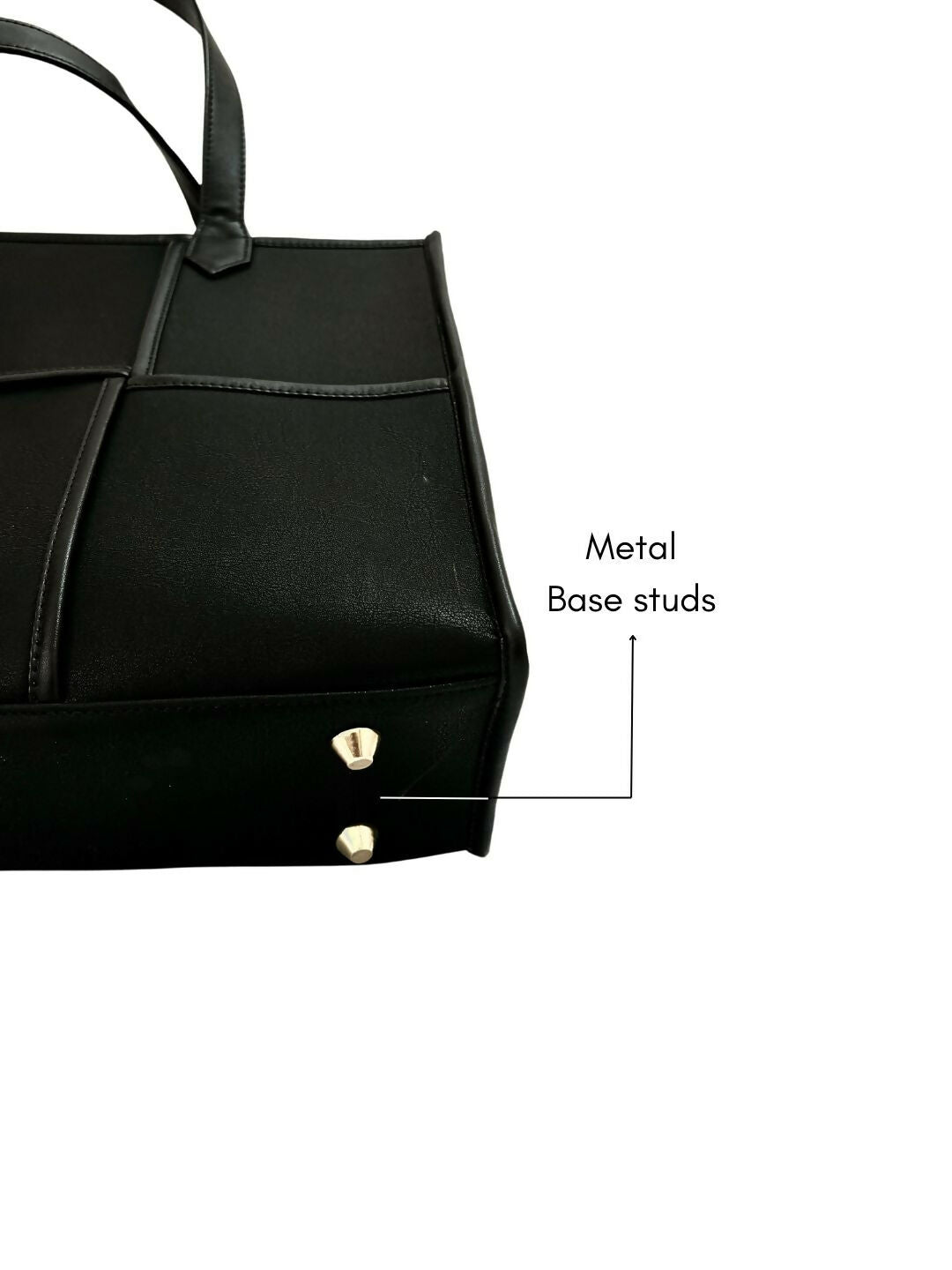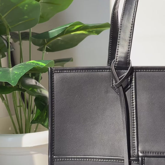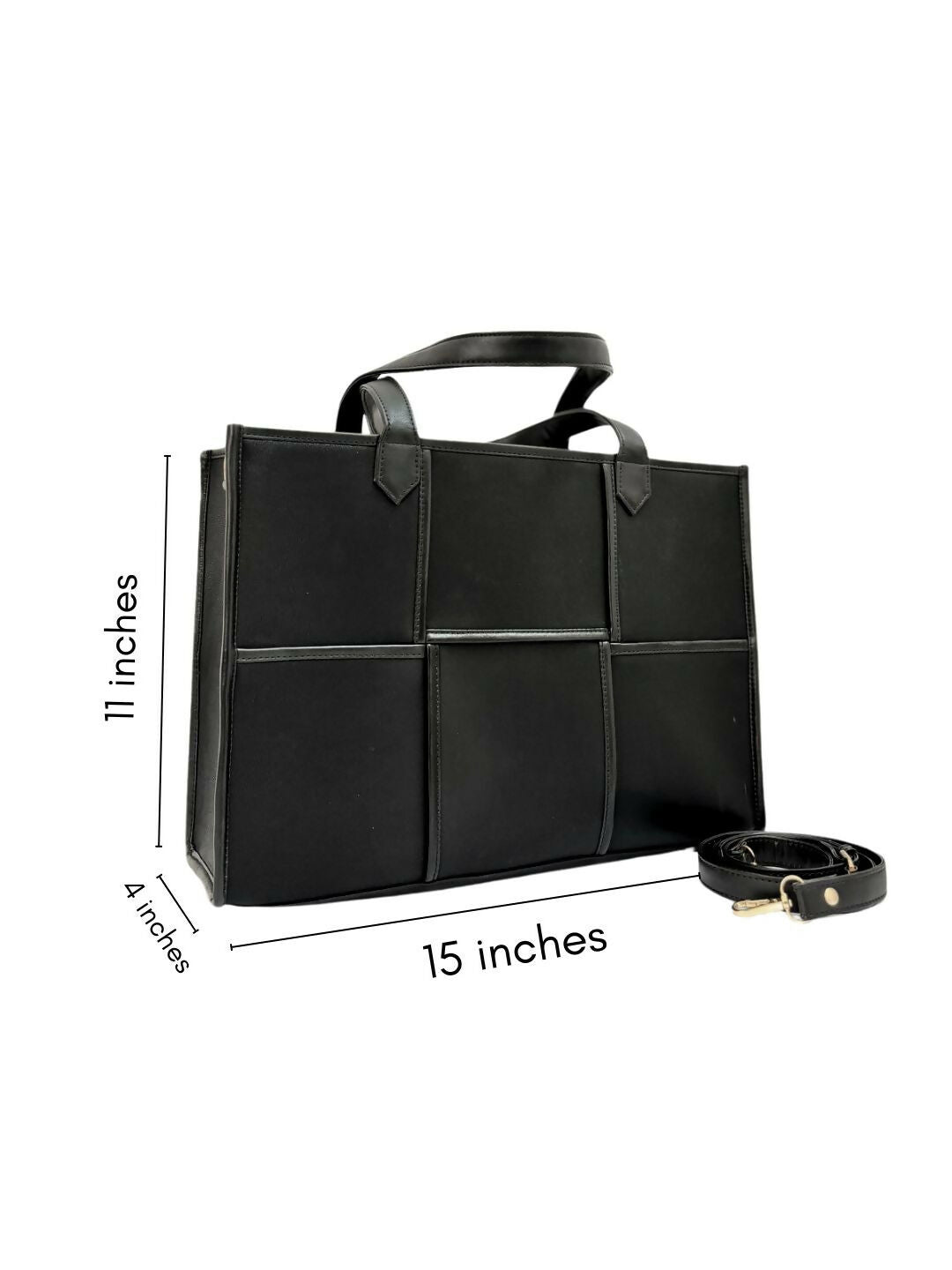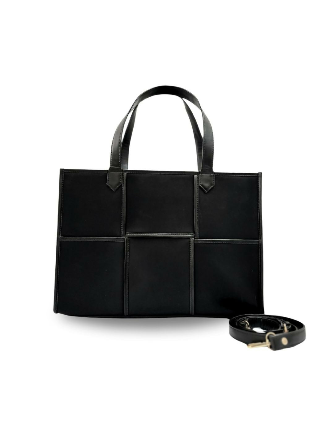 Fashioned from sustainable canvas embellished with sleek faux leather strips, Ace tote bag is a soft day-to-evening bag with a long, removable strap in addition to the top handles. The roomy inside compartment is lined and includes two pockets to keep your essentials safe. The medium size can carry upto 14" laptop.