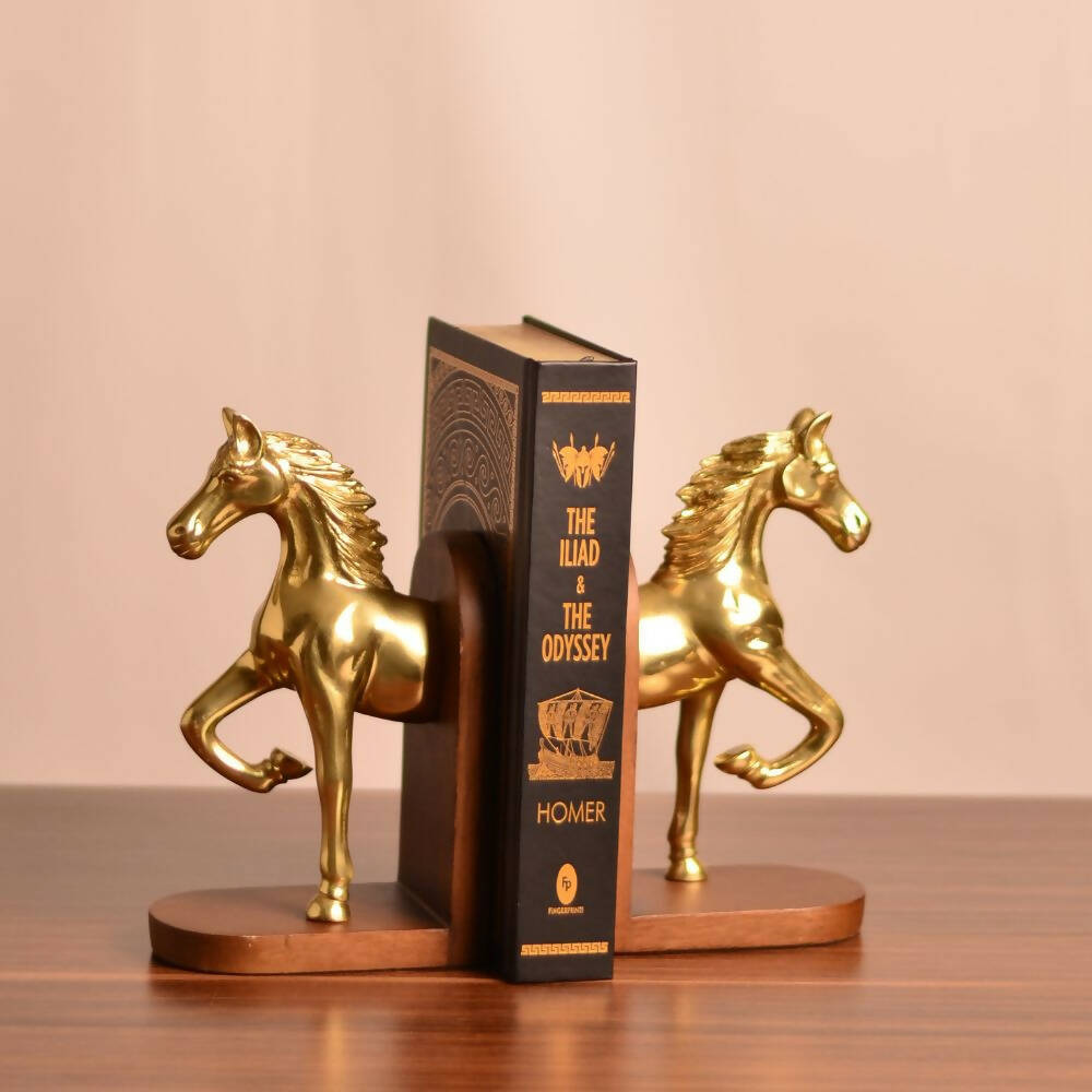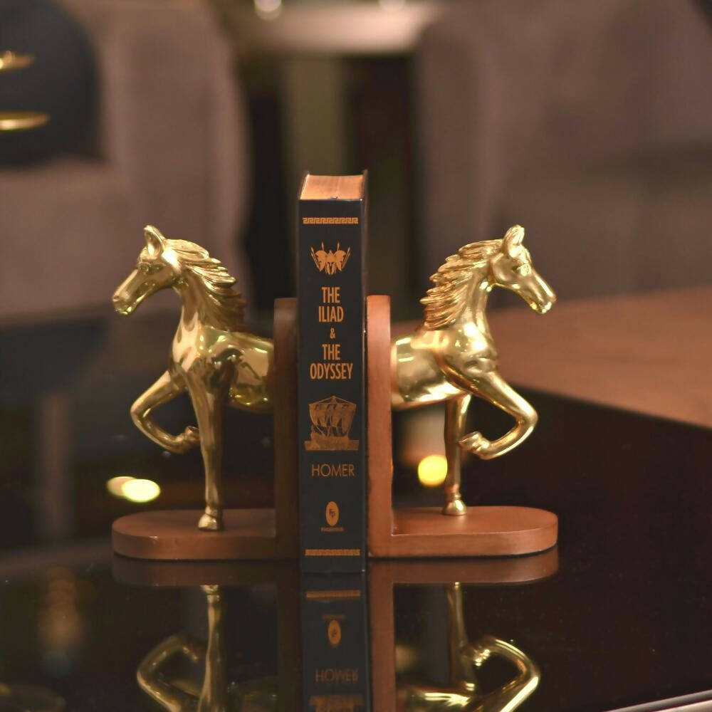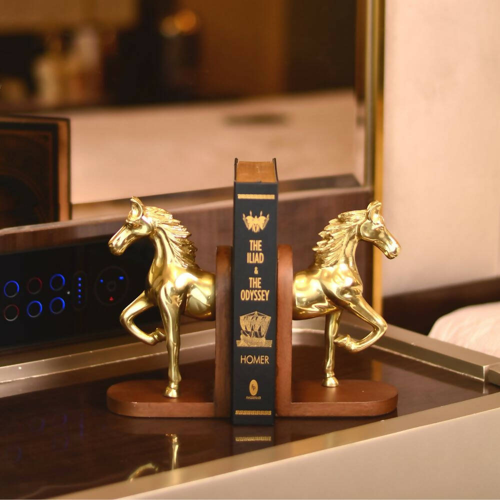 These attractive metal and walnut wood bookends are perfect for holding your favourite books on a shelf or console table. They add luxe and ambience to any space in your homes. This would be a perfect and charming way to display and organise your books. These bookends feature beautifully sculpted horse figures, capturing the essence of these magnificent creatures. The intricate craftsmanship and superior materials guarantee that these bookends remain cherished items in your home for years to come. They seamlessly blend with a variety of interior design styles, from classic to contemporary, rustic to modern. These bookends can be showcased in libraries, living rooms, offices, kids rooms, or any space that deserves a touch of elegance and organization.