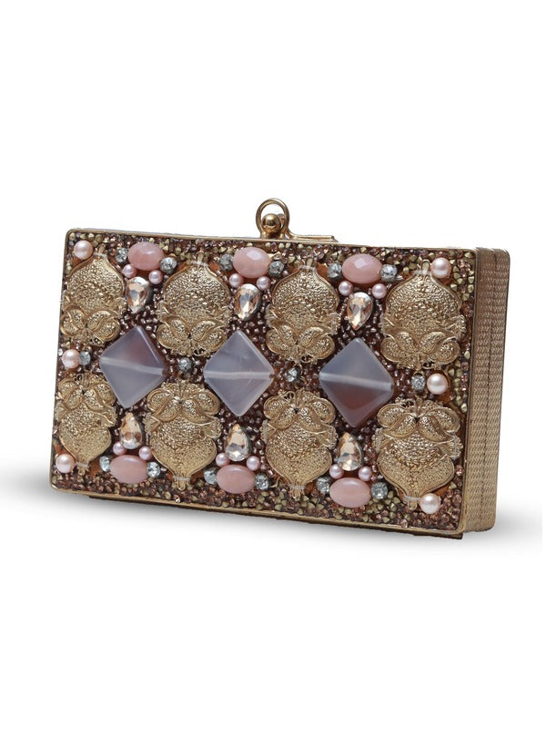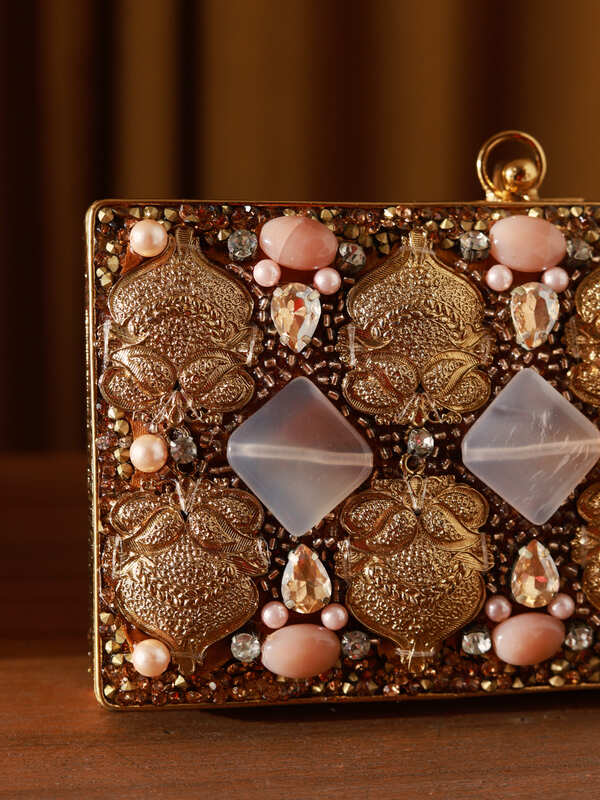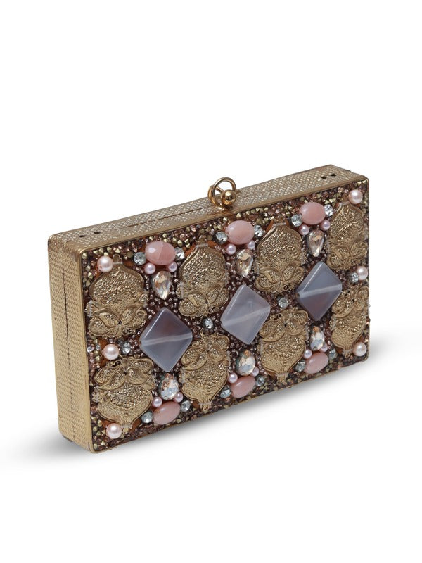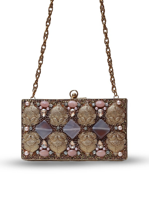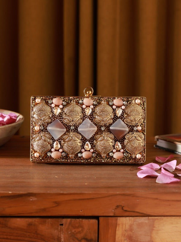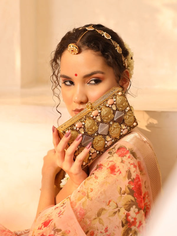 The Arya Embellished Brass Clutch is a striking blend of luxury and artistry. Crafted with intricate embellishments on a sleek brass base, this clutch exudes elegance and sophistication. Its refined design makes it the perfect accessory for evening events, adding a touch of glamour and timeless appeal to any ensemble.