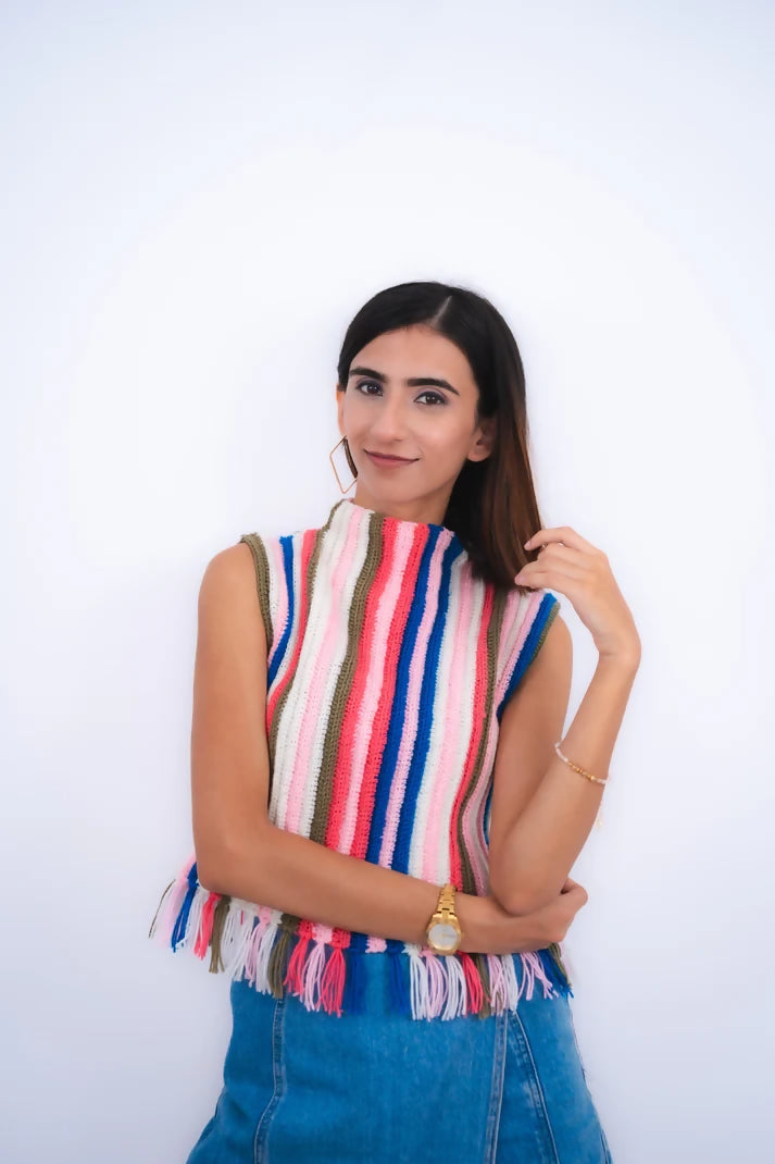 Add a pop of color with our handcrafted sleeveless crochet vest, featuring vibrant stripes and playful tassels. This bold piece adds energy and style to your wardrobe. The colorful stripes bring a dynamic look, while tassels add a bohemian flair. Sleeveless for comfort, it's perfect for layering.