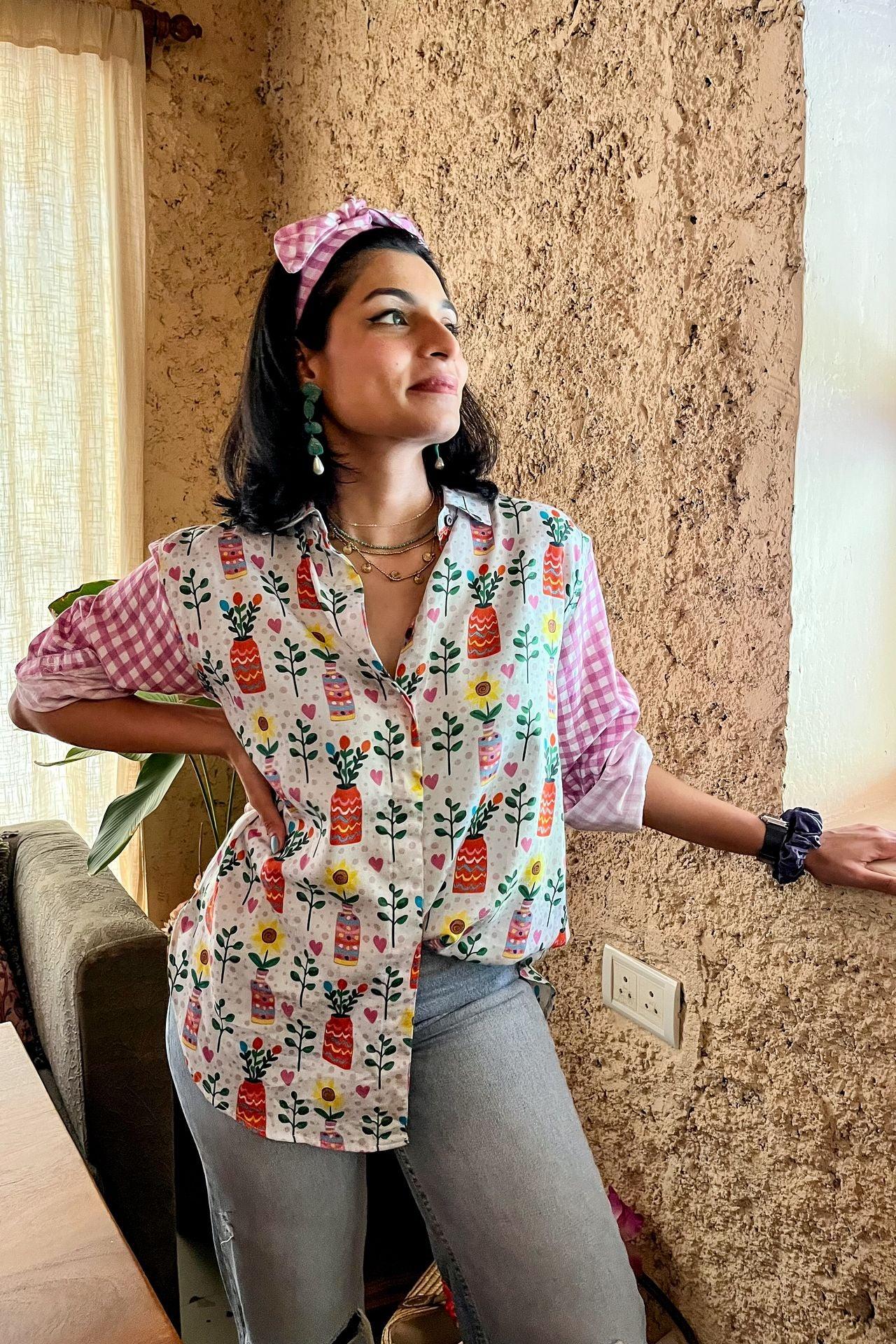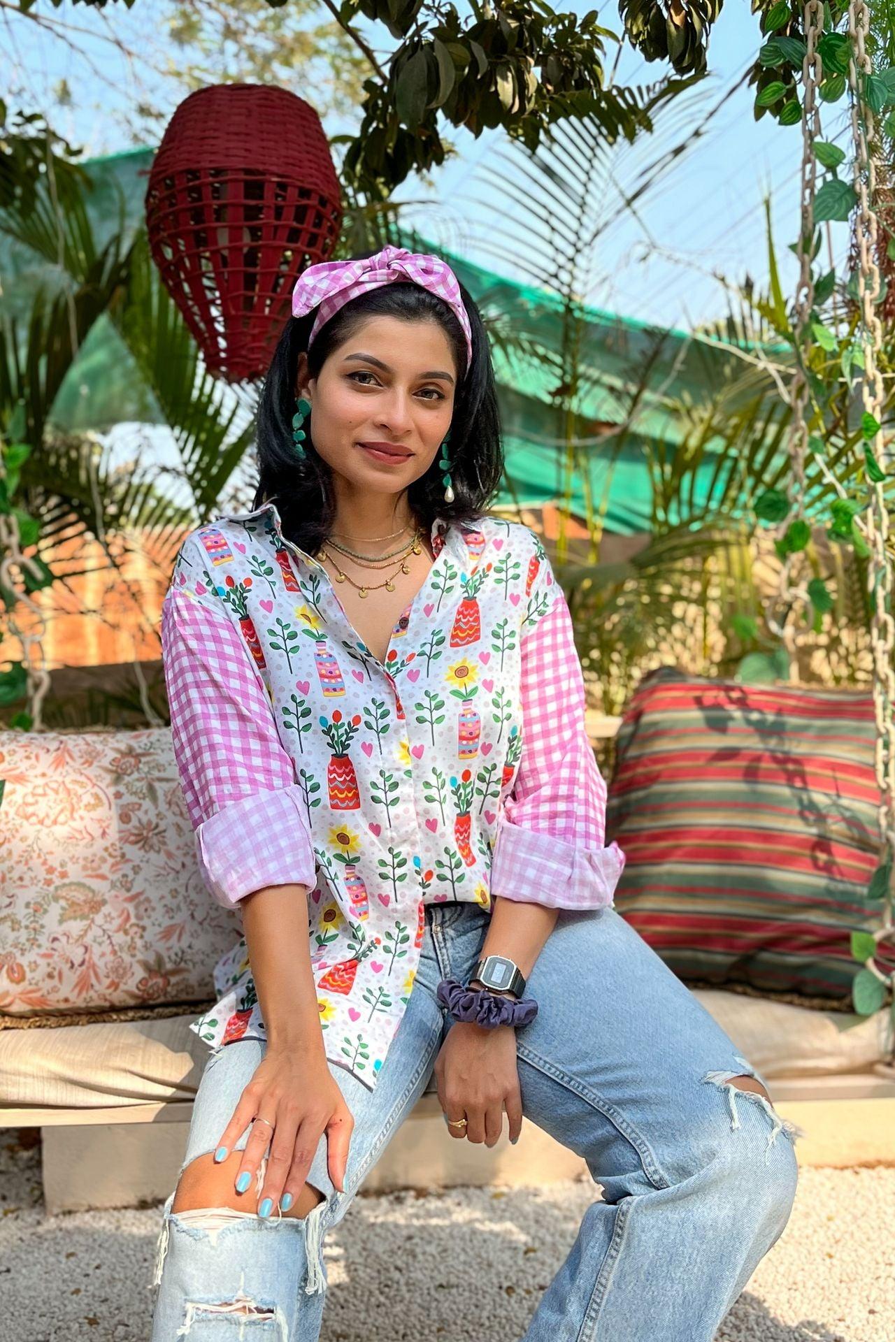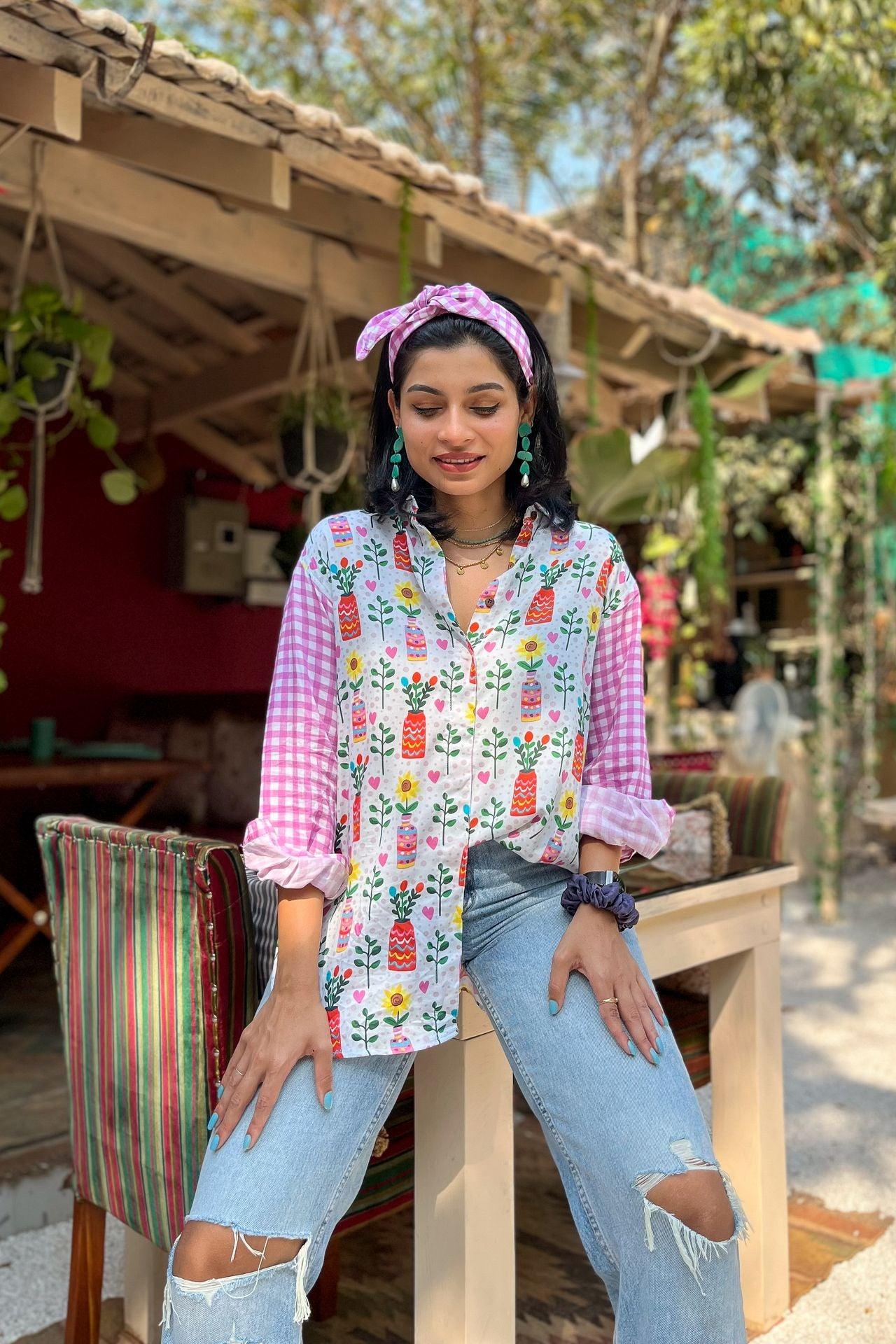 It's a good day to stay in and have pancakes for breakfast? In that case, you can just pull out this adorable oversized shirt that's all cotton and all cute for a casual mood. There's something about flowers and a good old pastel check coming together that warms our heart, and so, leave us with our pancakes and sunshine and let us daydream. If we were you, we would be wear this shirt with comfy shorts or mom jeans for a retro fit.