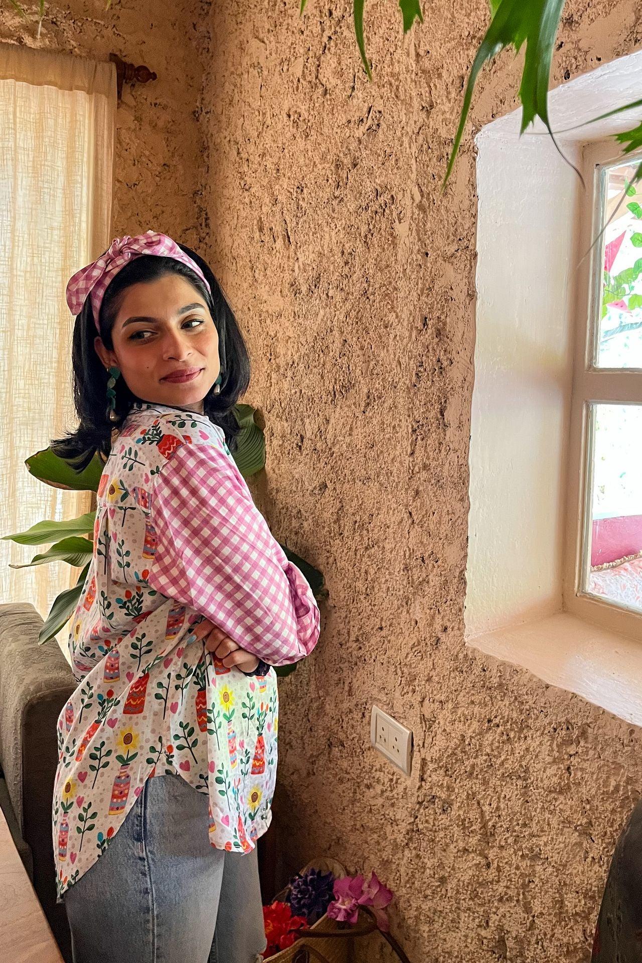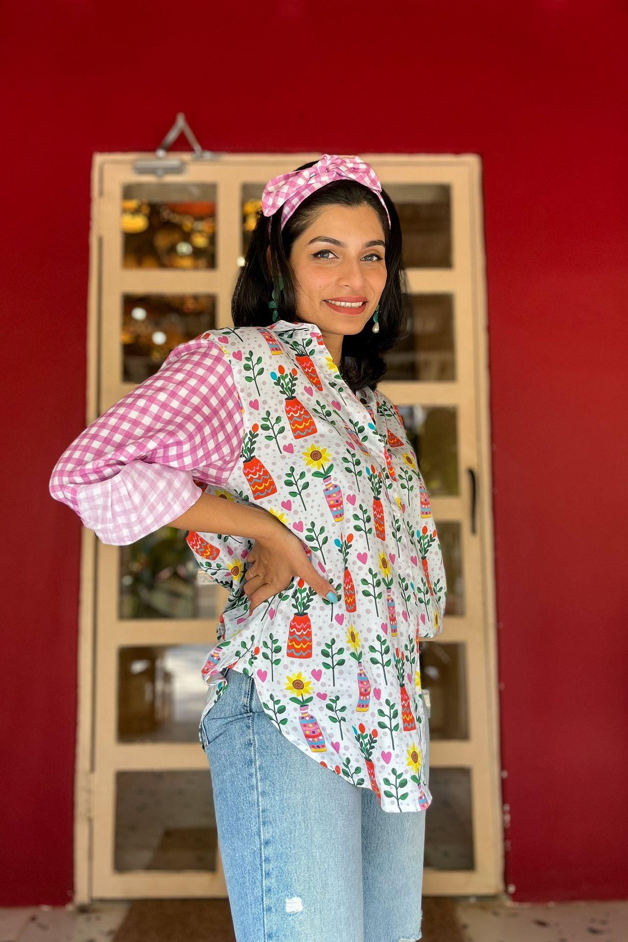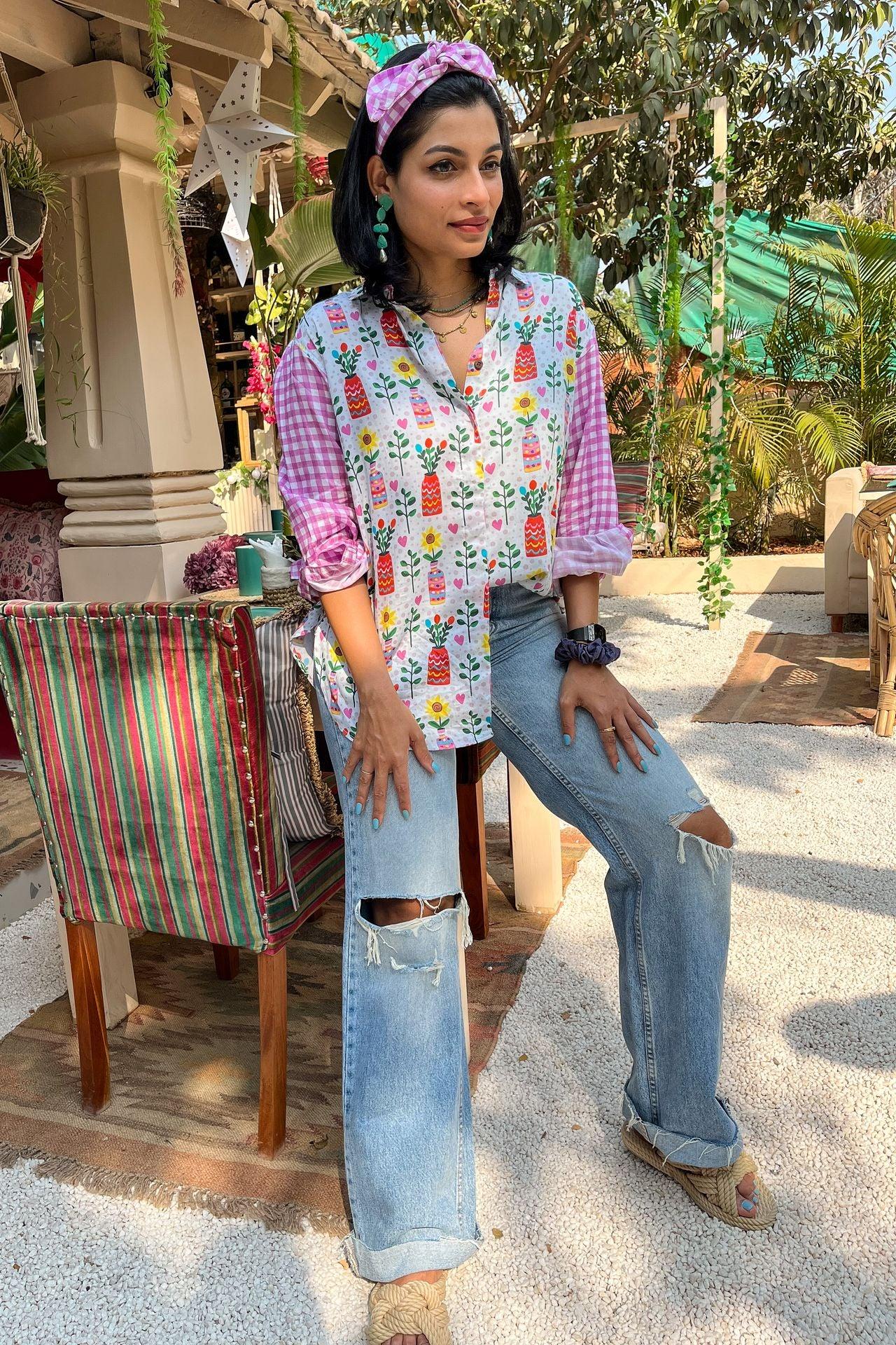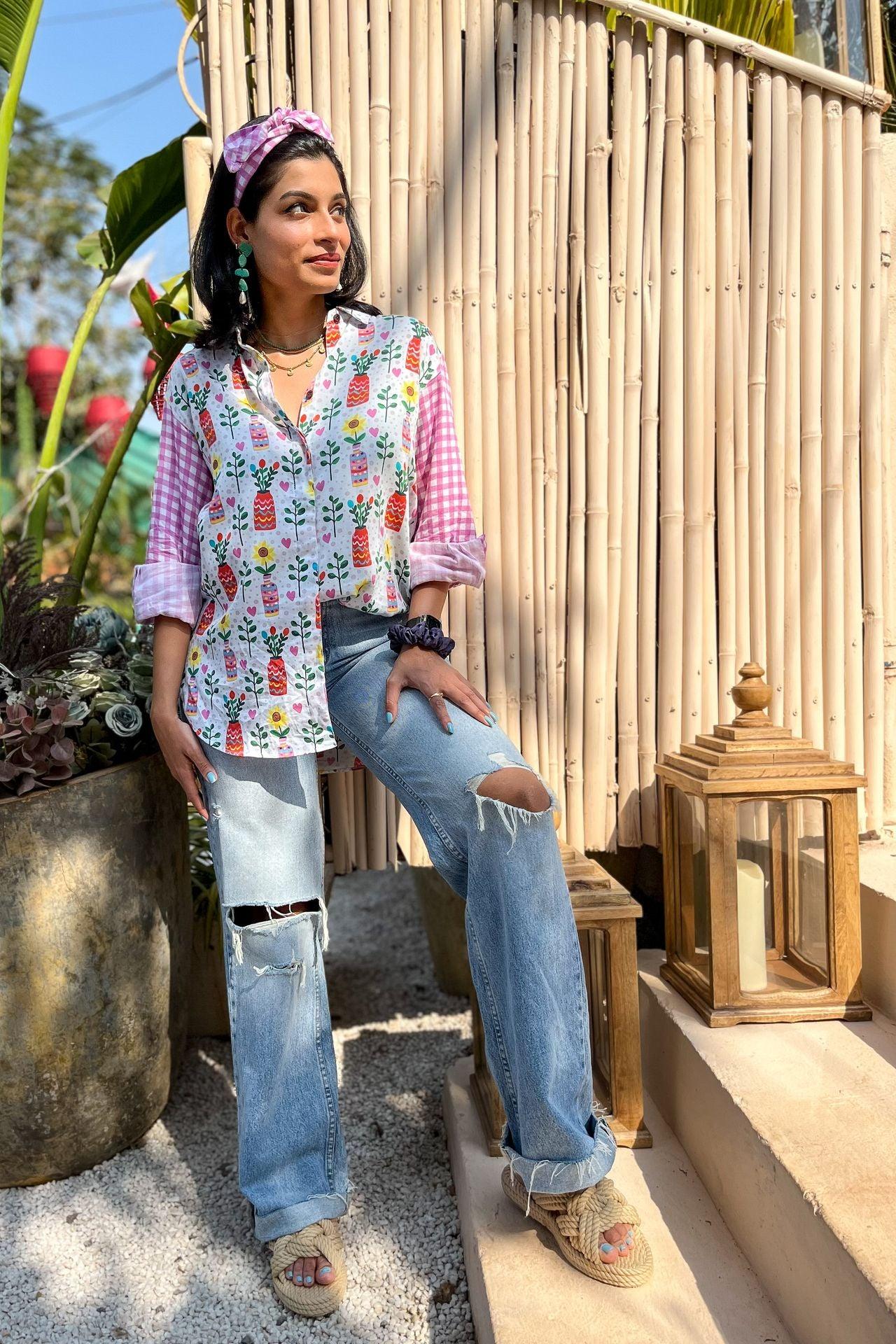 It's a good day to stay in and have pancakes for breakfast? In that case, you can just pull out this adorable oversized shirt that's all cotton and all cute for a casual mood. There's something about flowers and a good old pastel check coming together that warms our heart, and so, leave us with our pancakes and sunshine and let us daydream. If we were you, we would be wear this shirt with comfy shorts or mom jeans for a retro fit.