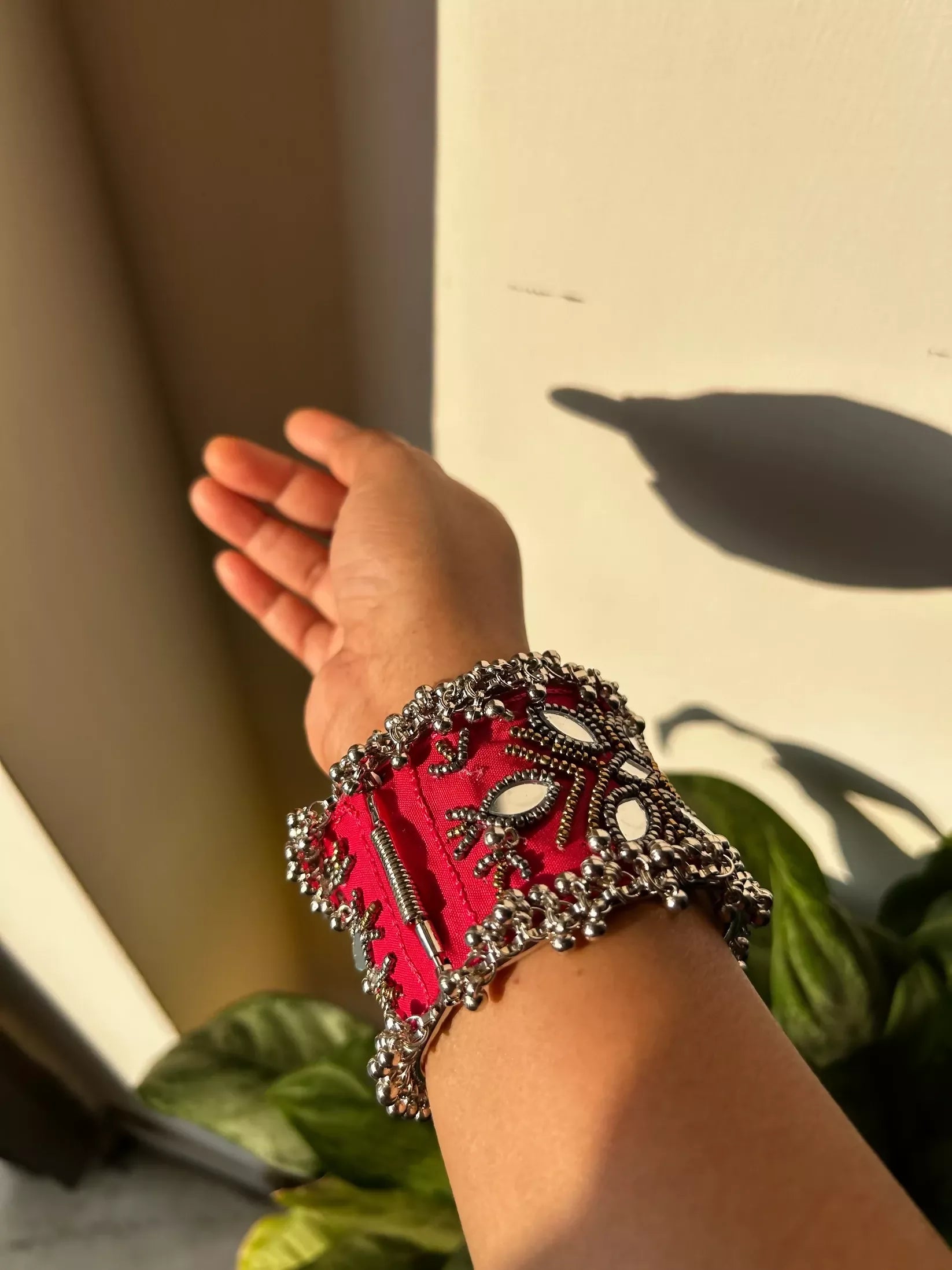 Elegant hand-embroidered cuffs in a vibrant pink hue, featuring intricate mirror work that adds a touch of traditional charm. Crafted with fine detailing, these statement accessories beautifully enhance any ethnic or contemporary outfit.