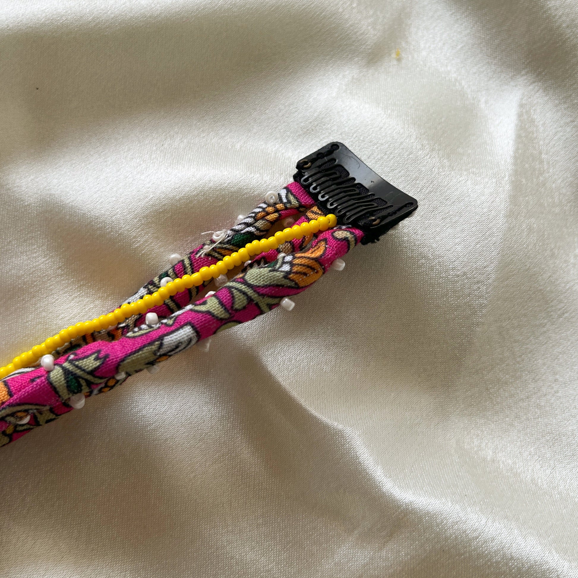 Elevate your hairstyle with this set of Cotton Fabric & Beaded Clip-In Hair Accessories. Featuring vibrant textile flowers and brass charm hangings, each bunch includes five beautifully crafted strands. A chic and effortless way to add texture, color, and charm to any look.