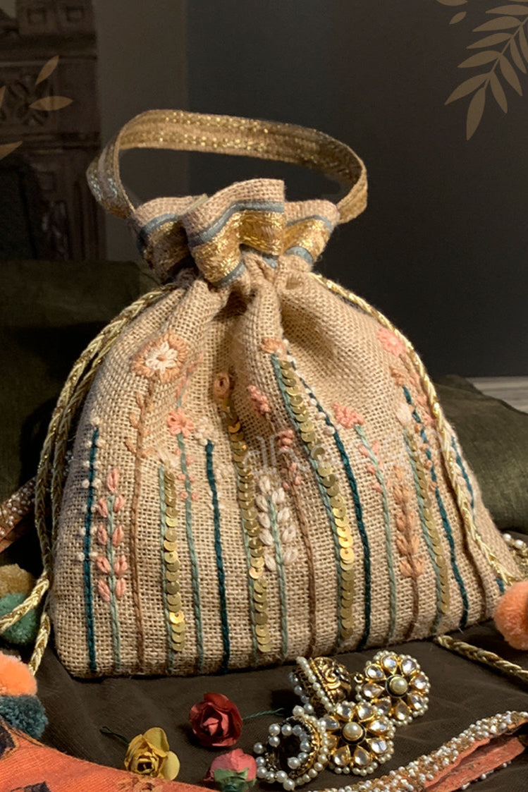 Buttercup flowers hand-embroidered on Jute potli, detailed with bugle beads to add the subtle luxe sheen, and pom poms adding to the final finishing touches.