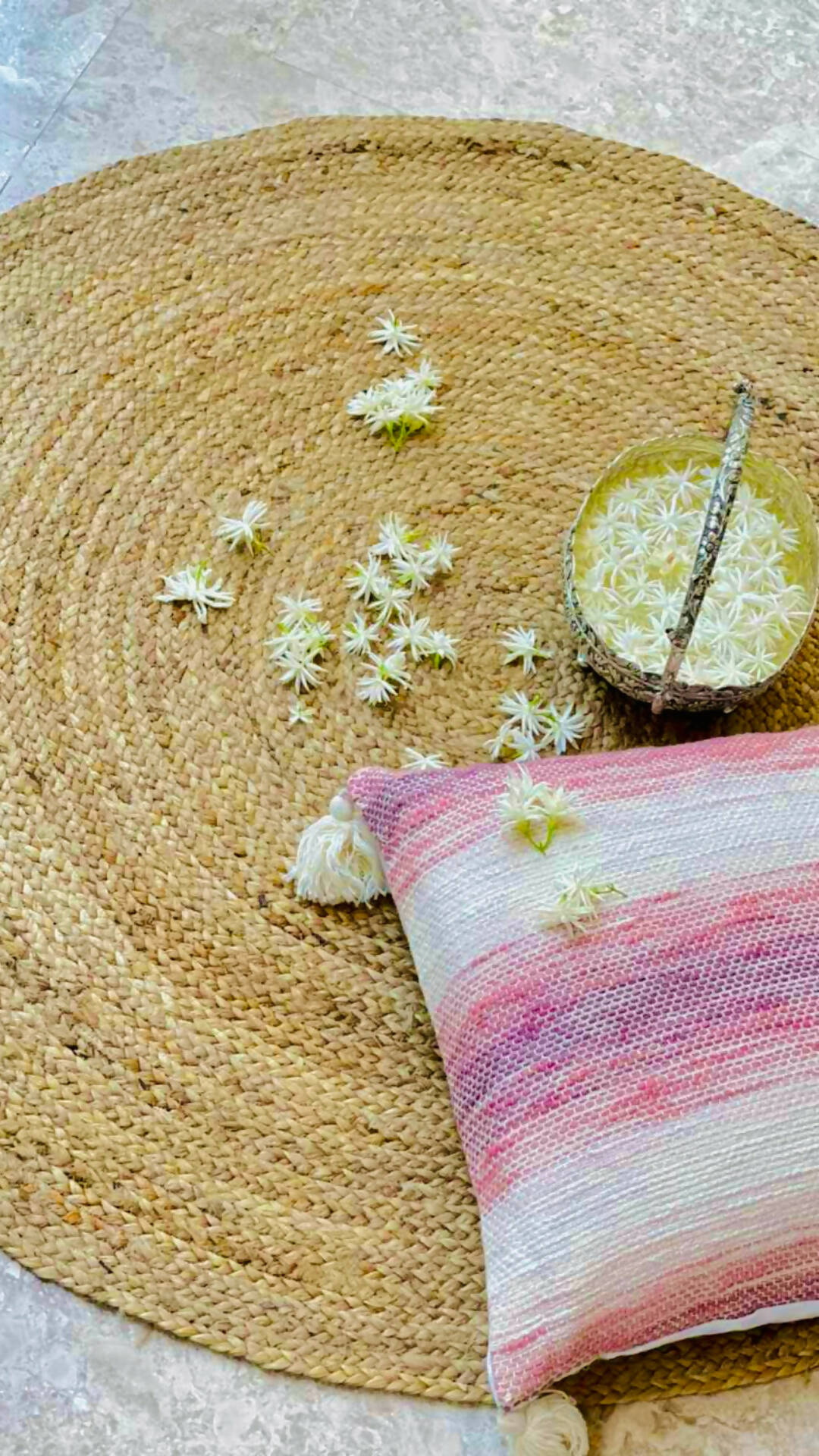 Handwoven of natural jute blend by skilled artisans. Crafted with sustainably harvested jute, a fast-growing, renewable natural fiber. Unique and attractive round shape. Multi-colored re-cycled yarns with jute fibers decorate the front with 100% Jute.